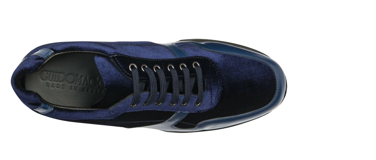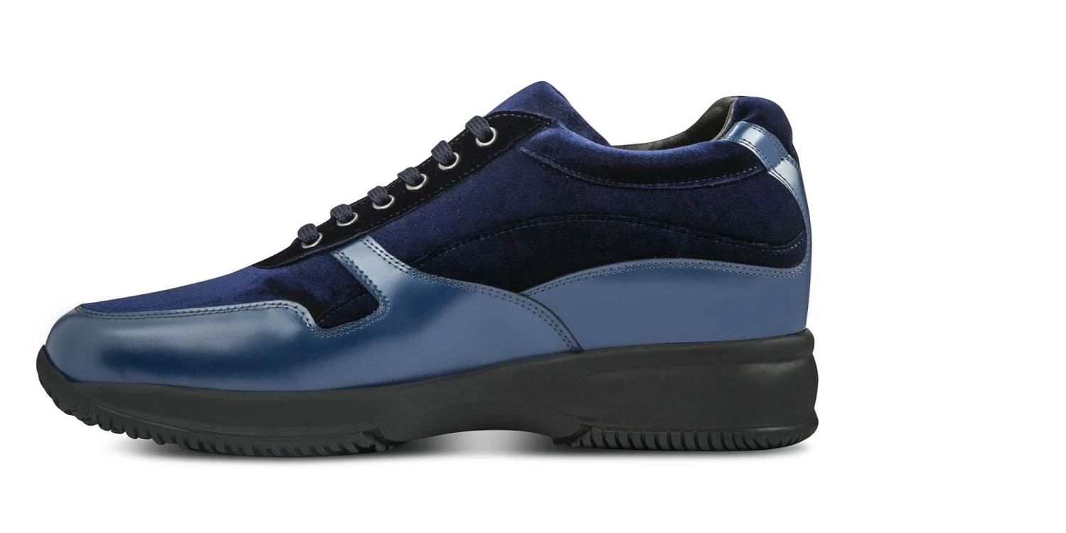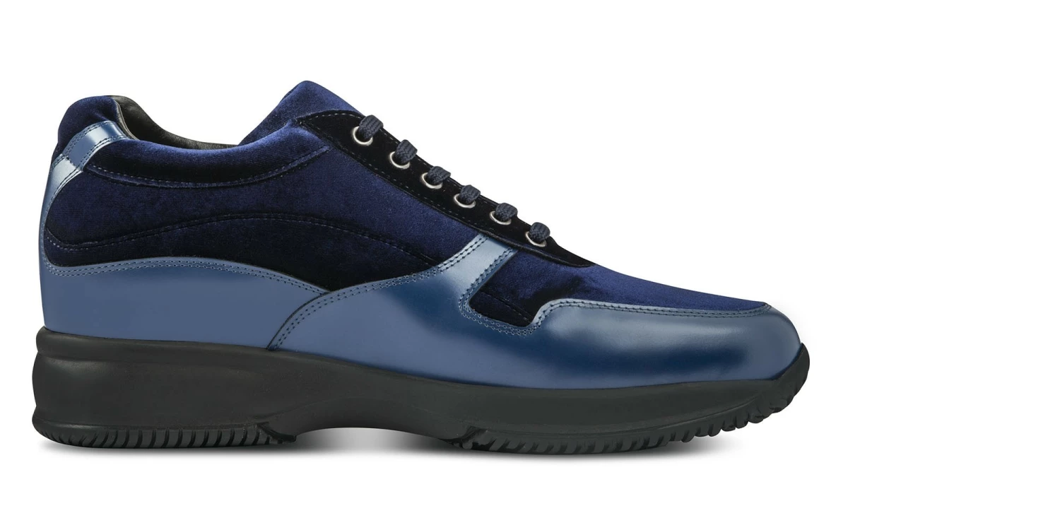 Handcrafted elevator sneakers with upper made of soft dark blue velvet and tone-on-tone shiny calfskin. The black sole is made of super-light natural rubber.