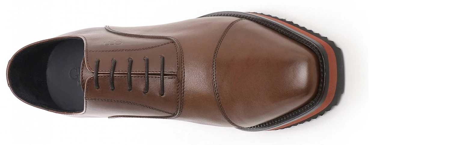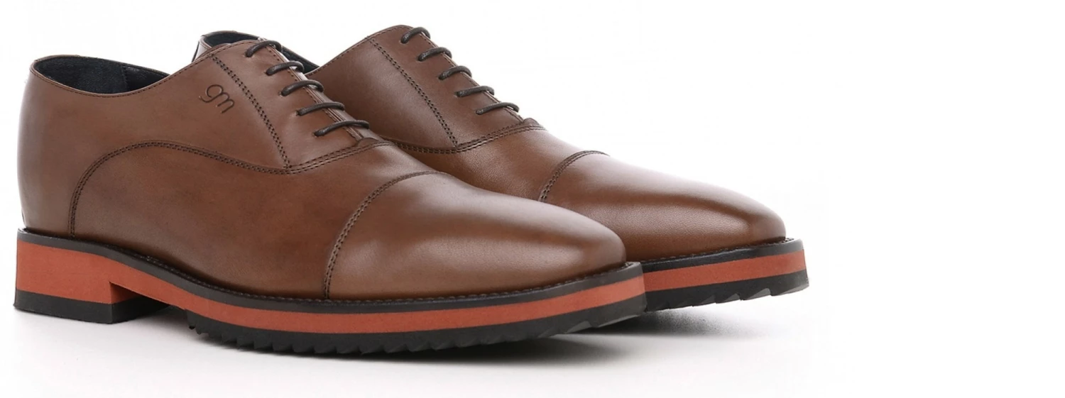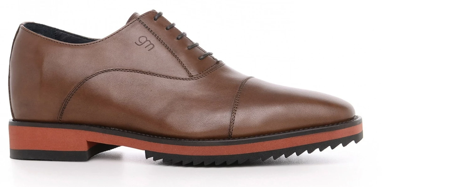 Elevator Oxford shoe with upper in brown calf leather and two-tone rubber sole.