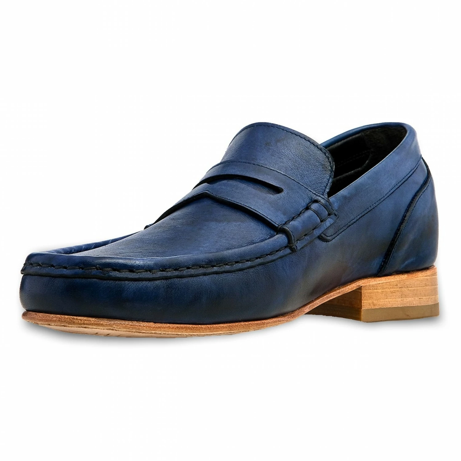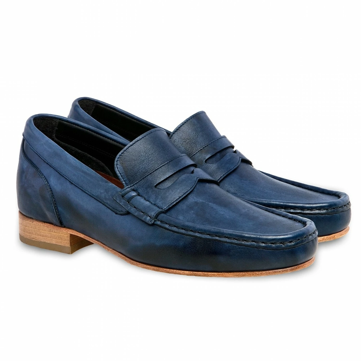 Upper in blue burnished full grain leather. Upper leather, outsole and midsole are sewn at sight.Insole and midsole in genuine leather. Leather heel with special anti-slip rubber. Handcrafted leather outsole with special anti-slip. Height increase: 2.6 in(6.5cm). Hand Made in Italy