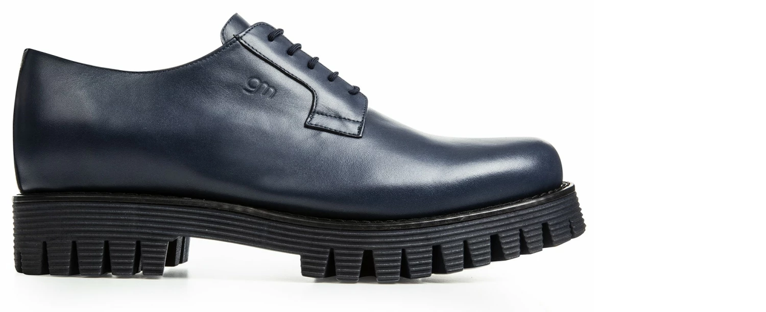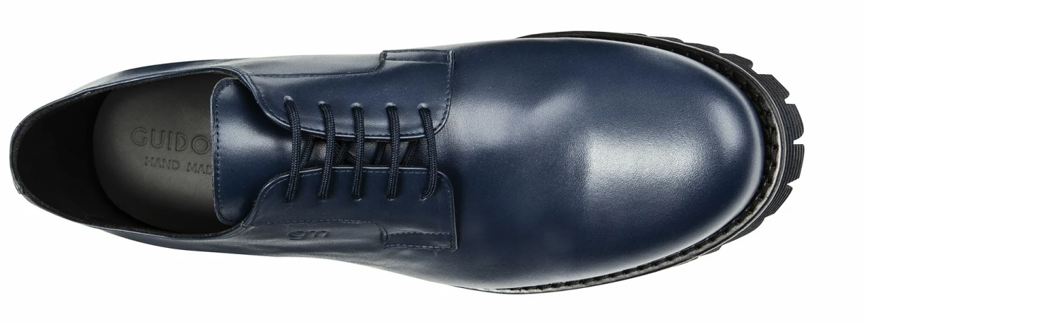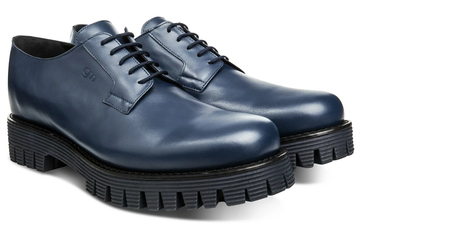Elevator derby shoe with a casual and contemporary design made of blue full-grain leather and lug striped blue sole in natural rubber.