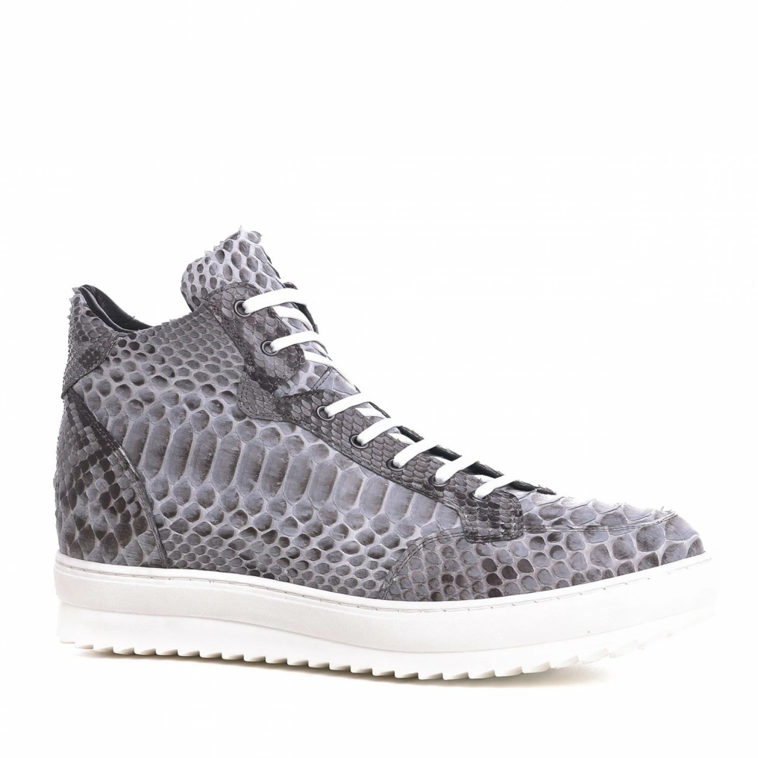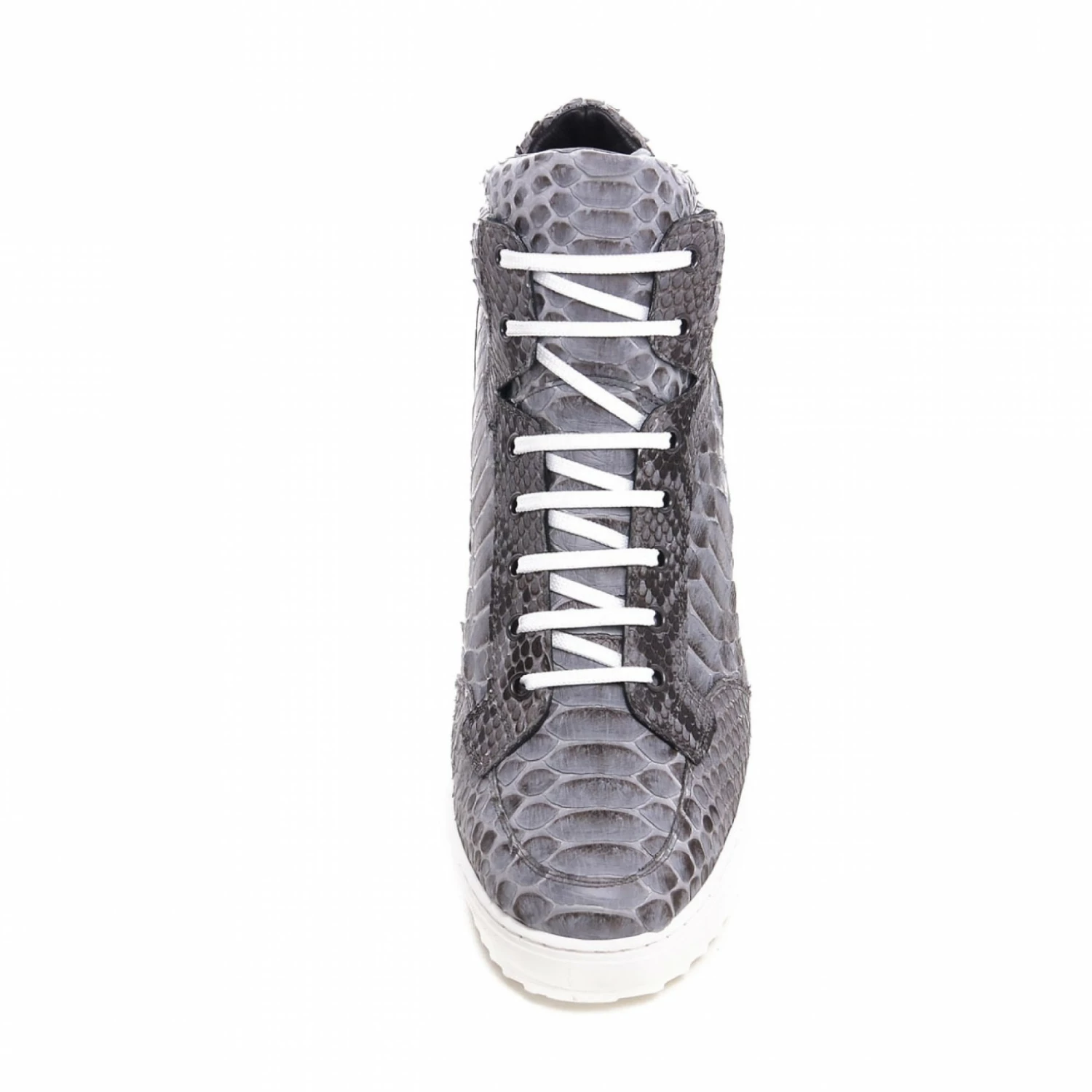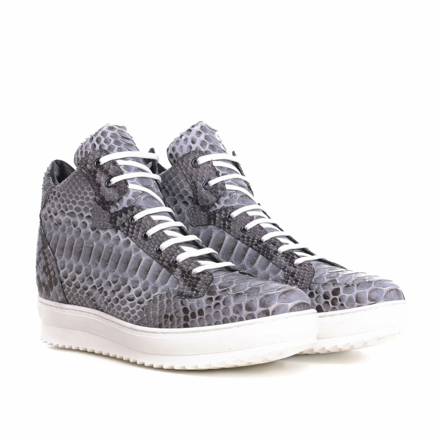 Height increasing sneakers with upper in gray python leather characterized by natural turquoise and black colour reflections. The white sole is made of super-light natural rubber.