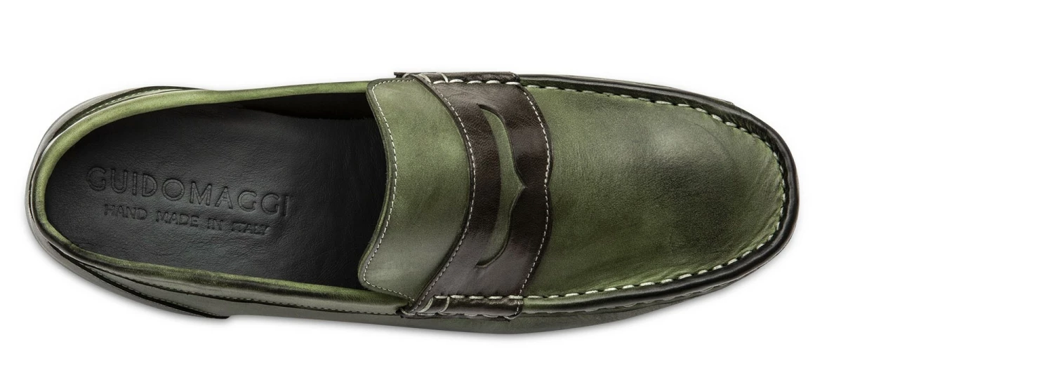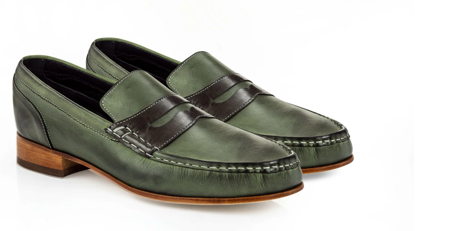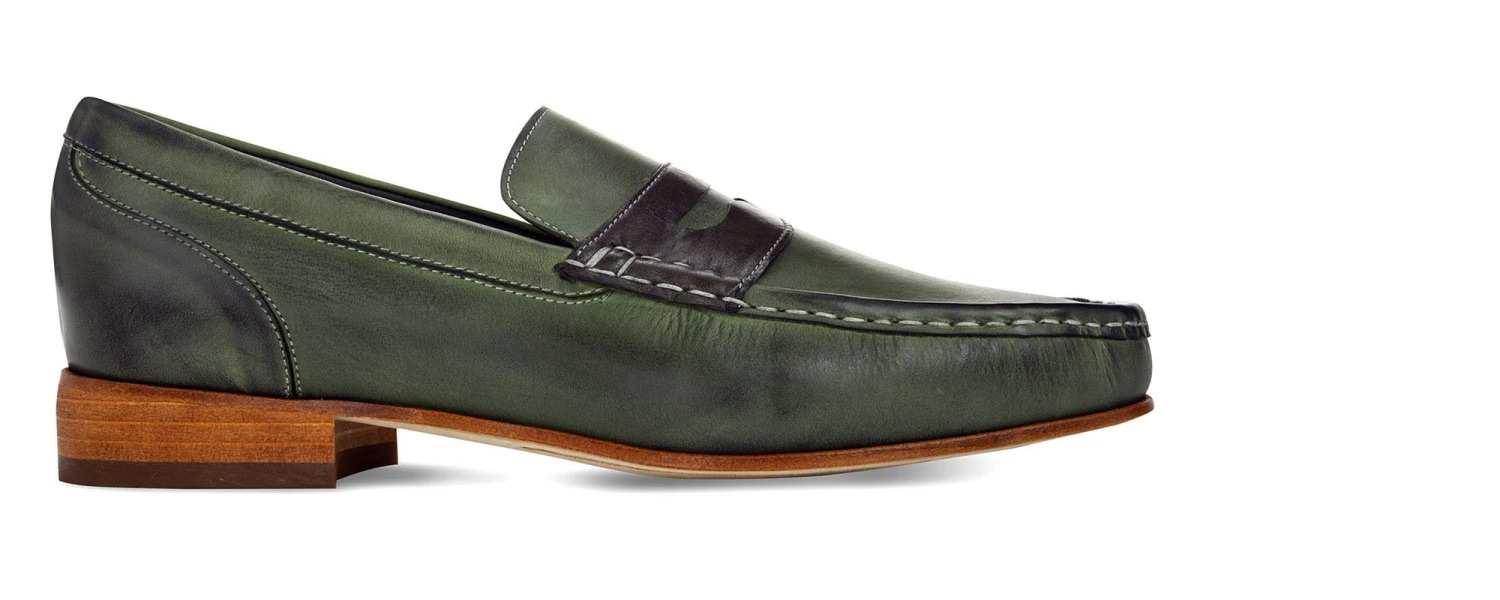 Elevator loafer with contemporary lines created with an attention to every detail. Handcrafted and made to-measure, this unique penny loafer with a green nuance and uneven hand-painting offers a distinctive charm. The new elevator model will give a neat and sophisticated touch to your outfit, adding up to 2.6 inches (6.5 cm) of extra height. Sole made of 100% Italian leather.