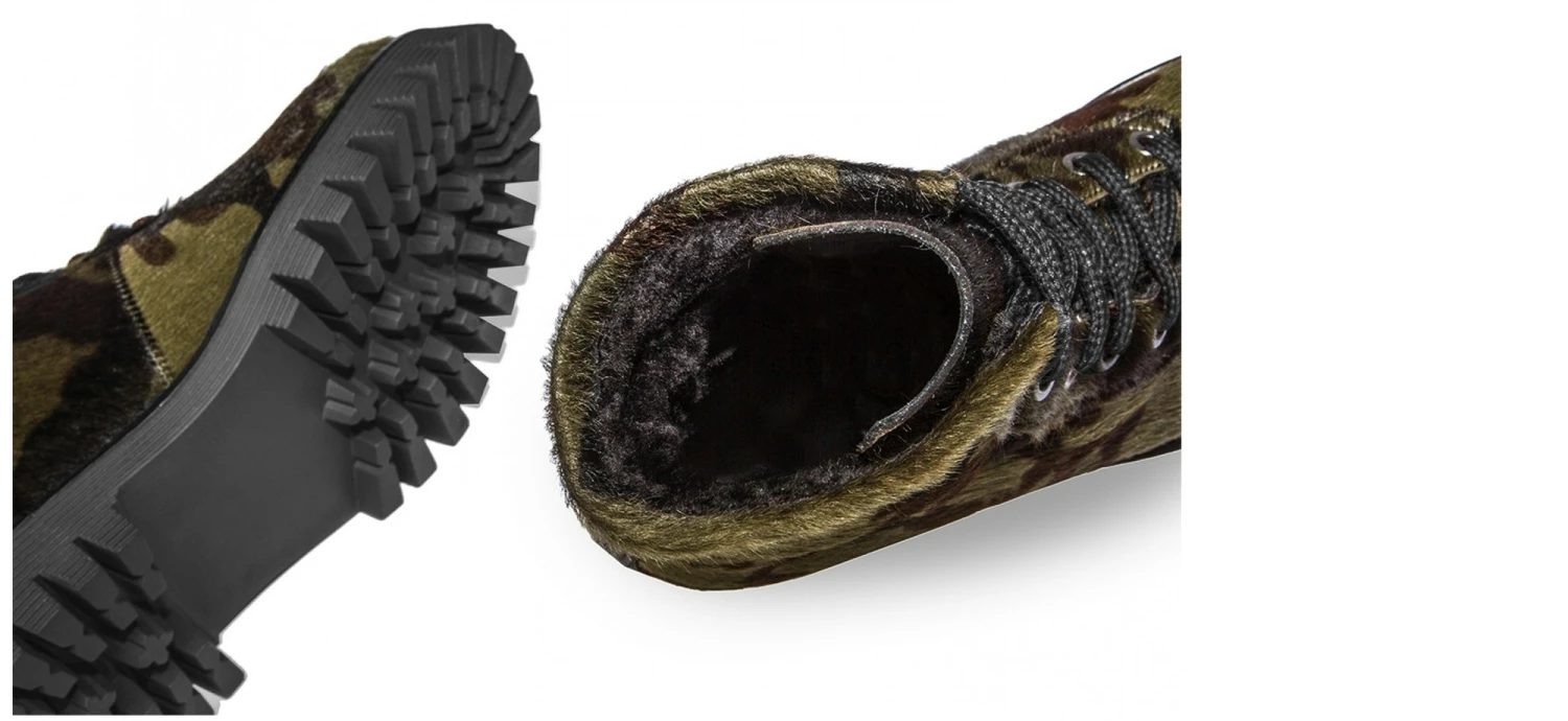 Miltary chic: elevator boots with upper in camouflage pony skin and soft sheepskin lining. The black striped sole is in super-light natural rubber. Black Chameleon is able to increase height from 2.4 (6 cm) up to 4 inches (10 cm) in absolute comfort.