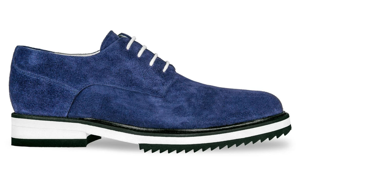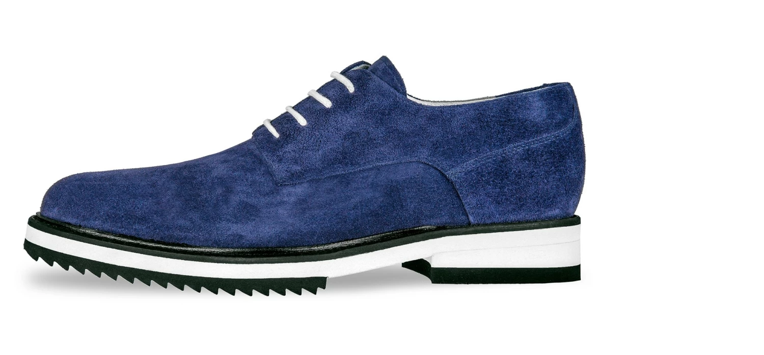 Spring must-haves: handcrafted elevator derby shoes with upper in fresh navy blue suede and two-tone black and white natural rubber sole.