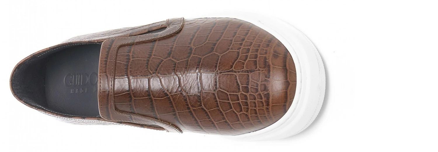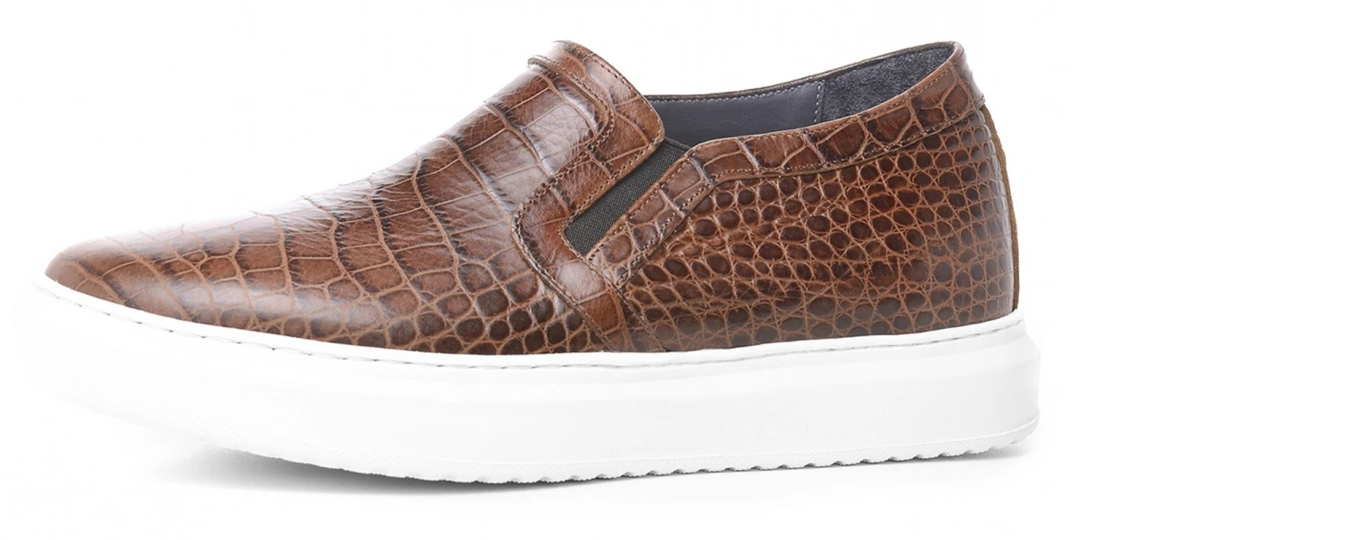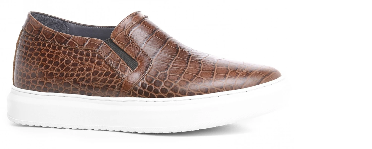 Handcrafted slip-on with 2.6 inches (6,5 Cm) elevator system featuring upper in brown calf leather printed crocodile and comfortable rubber sole.