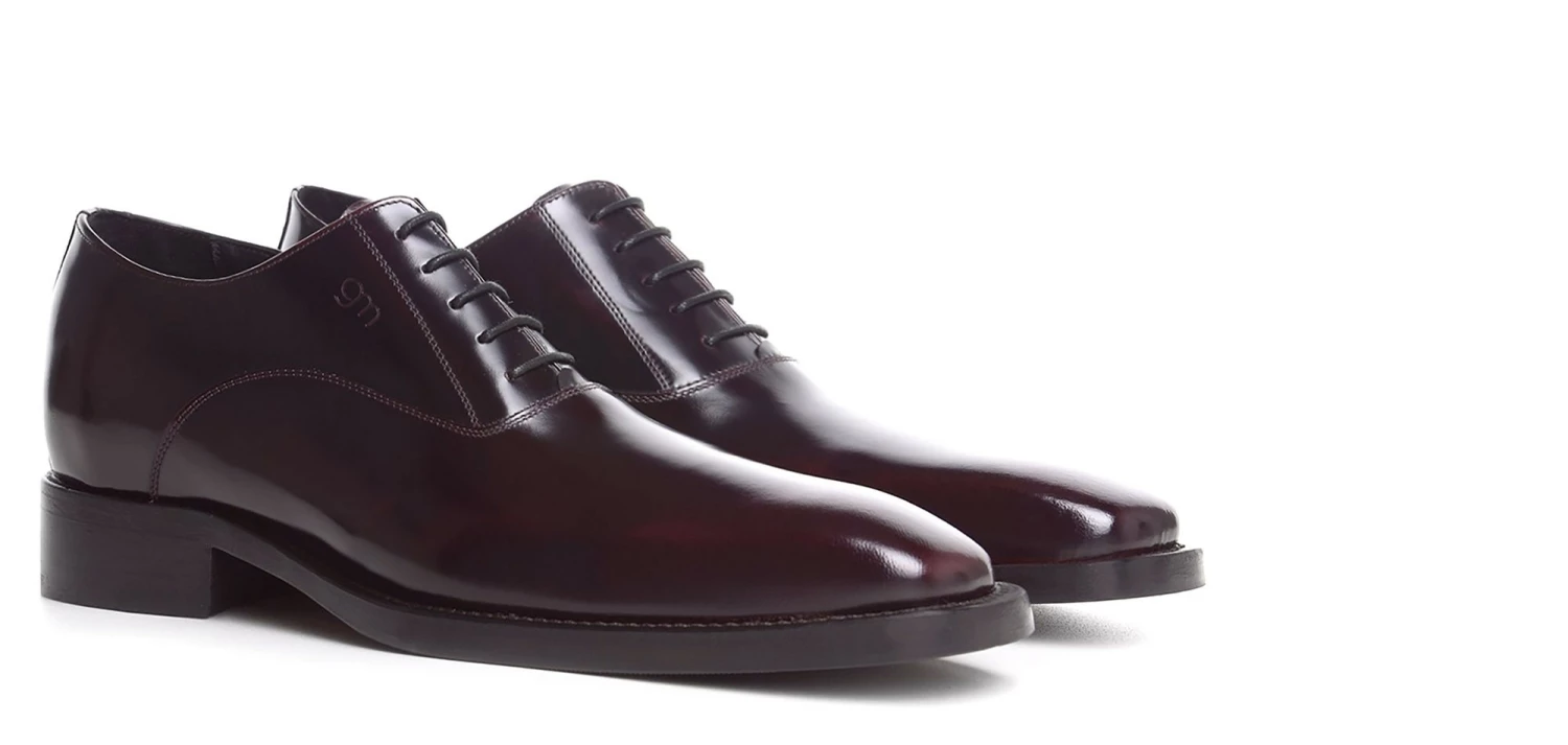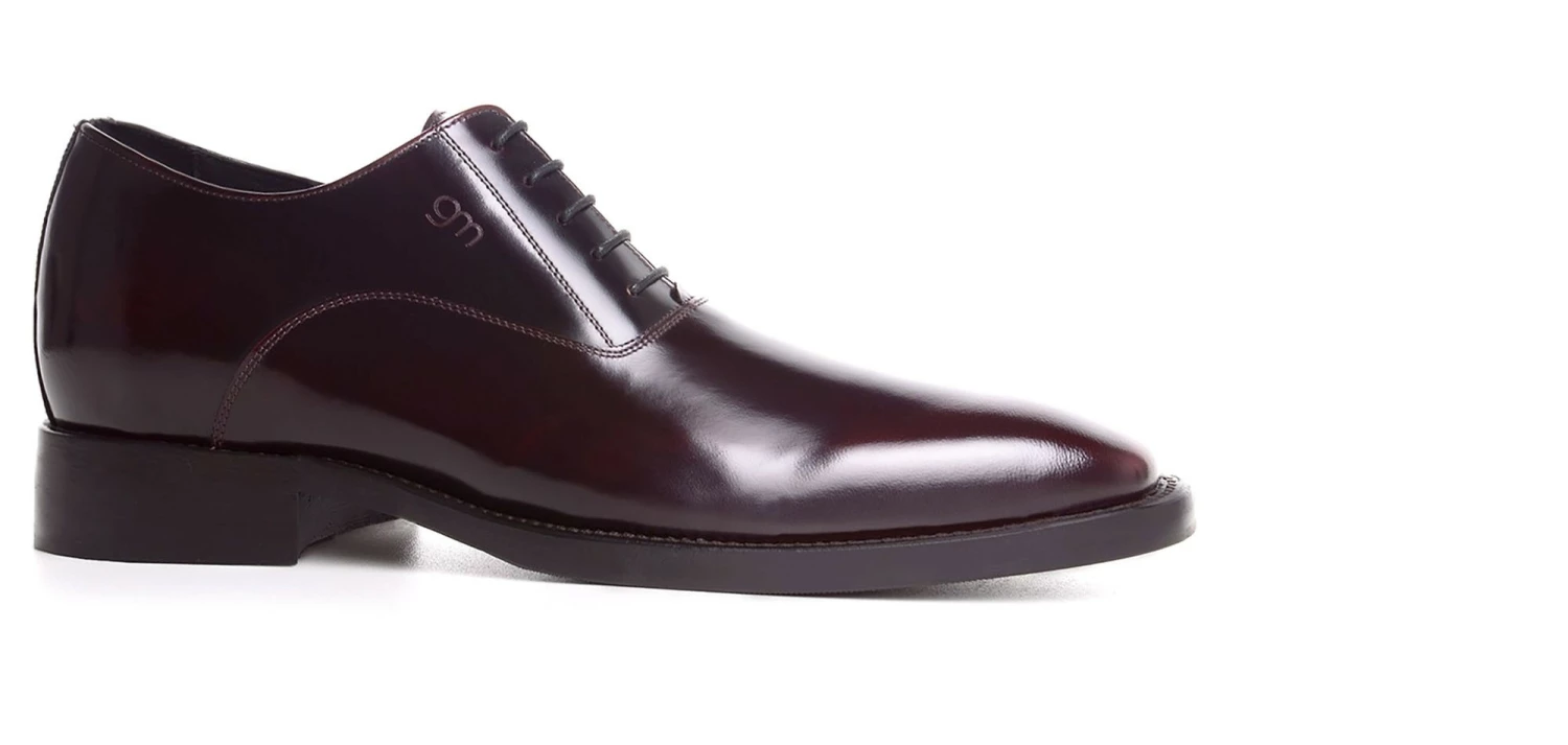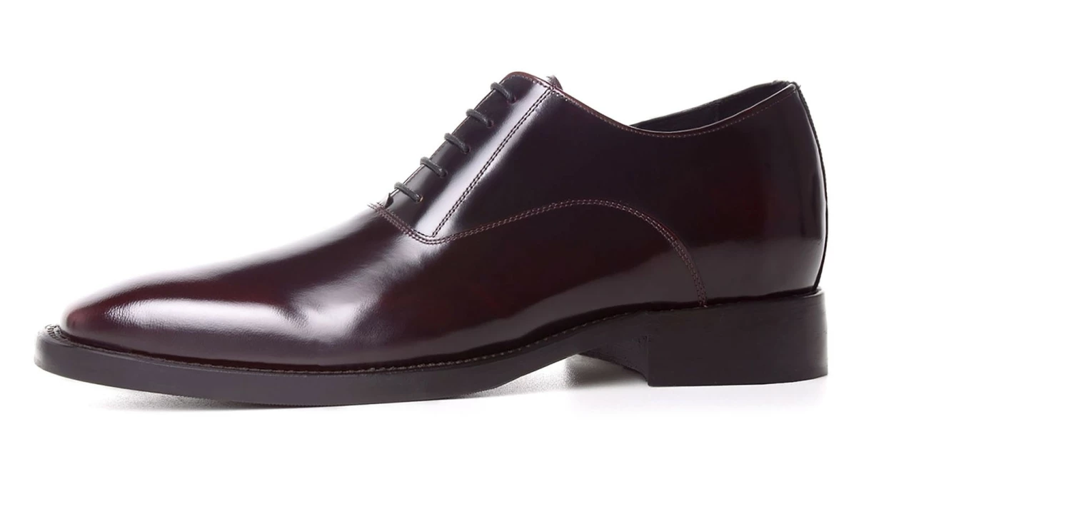Elegant elevator dress shoe with upper in brushed calfskin and stiched leather sole with anti slip rubber. A model of extreme class, where the special craft creates distinctive burgundy reflections.