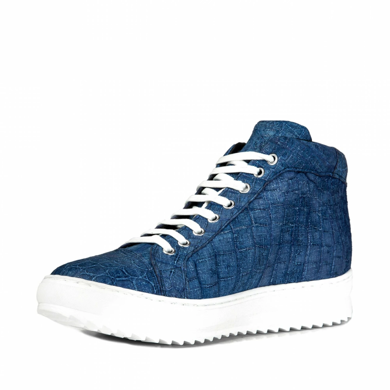 Trendy and dynamic: mid-top elevator sneakers made of fine Hermès crocodile leather featuring a unique denim-effect blue colour and extra light natural rubber sole that ensures maximum comfort.