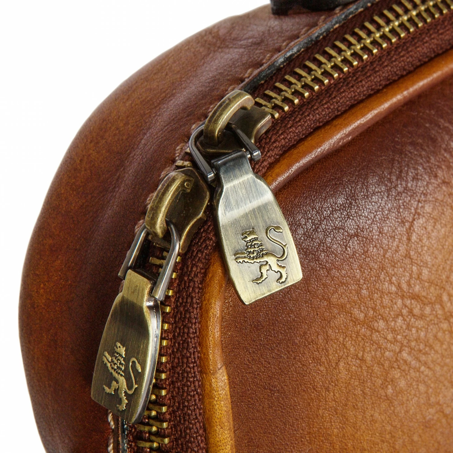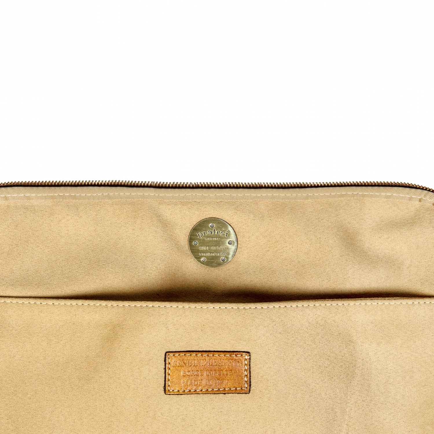 Laptop briefcase made of Tuscan full-grain vegetable-tanned leather of an intense brown leather tone, naturally aged.