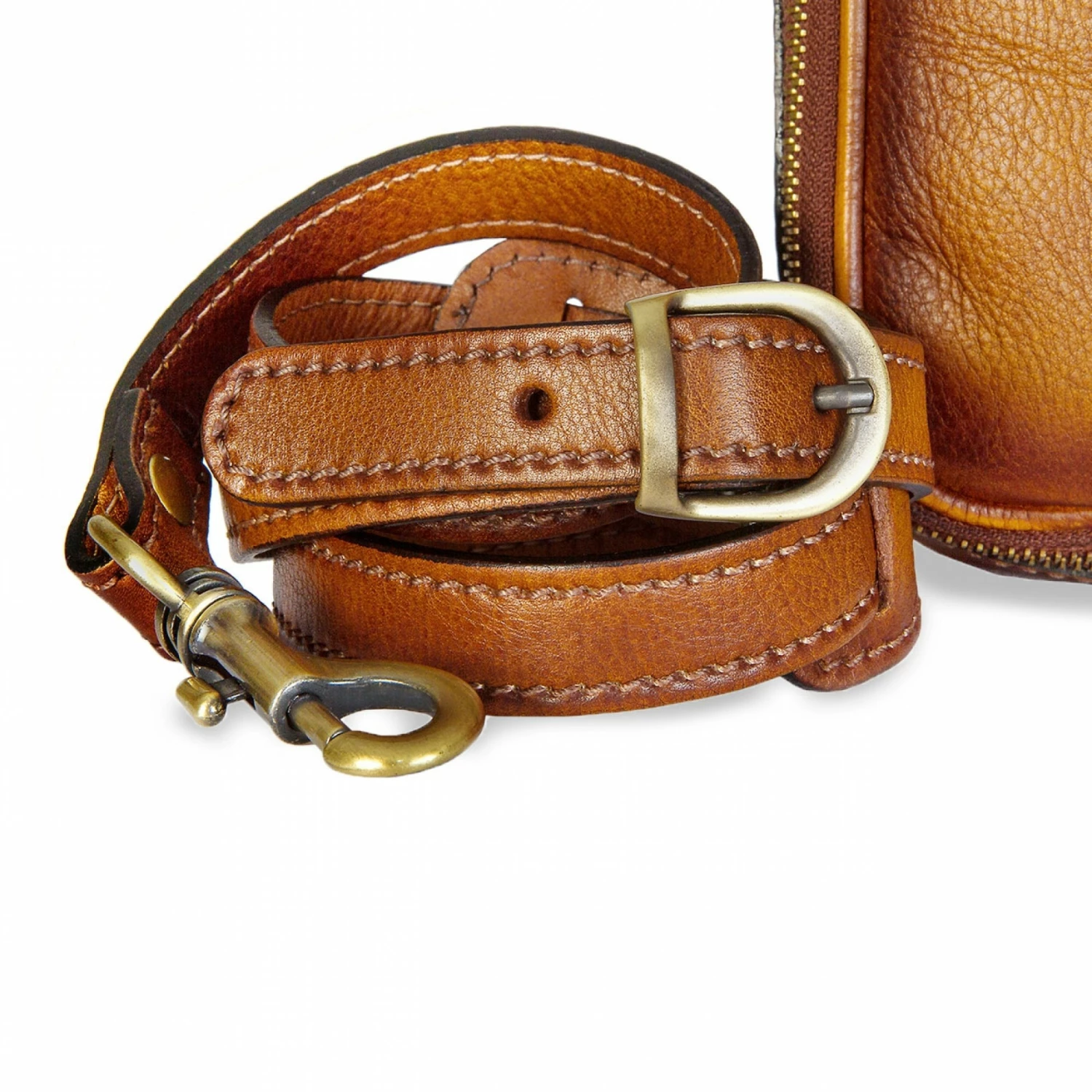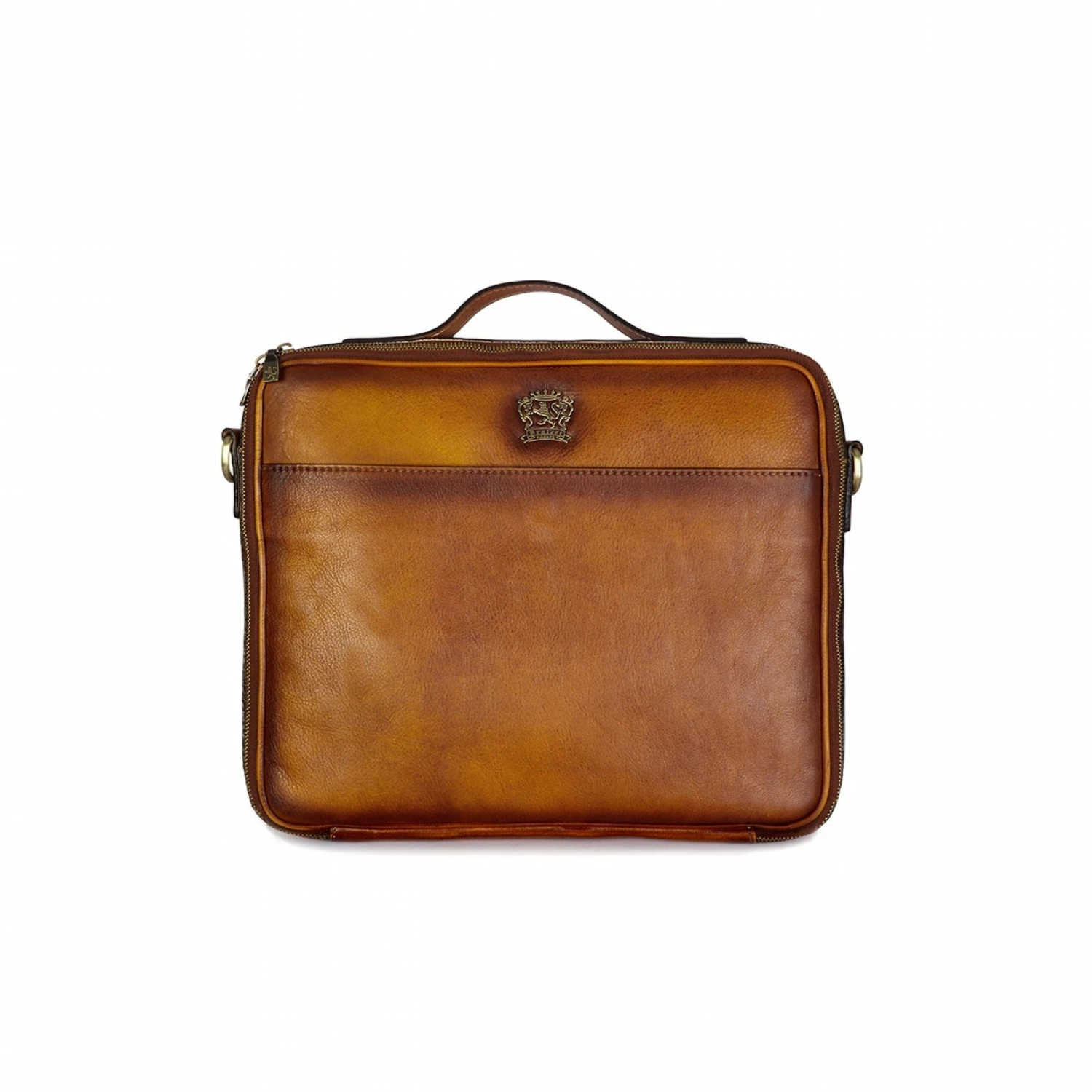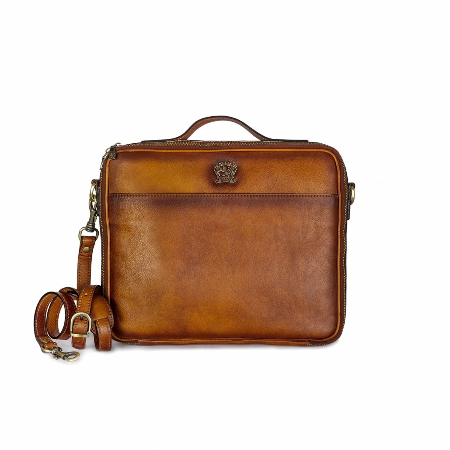 This briefcase with shoulder strap features a laptop compartment, an internal document pocket and an external pocket for documents / magazines. The closure is regulated by zip. Handmade in Italy.