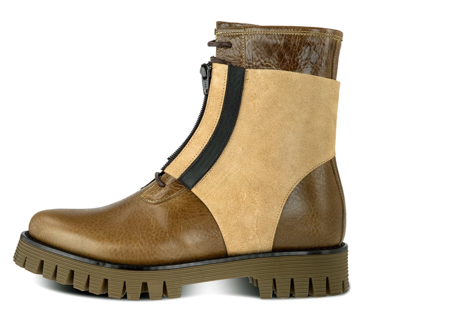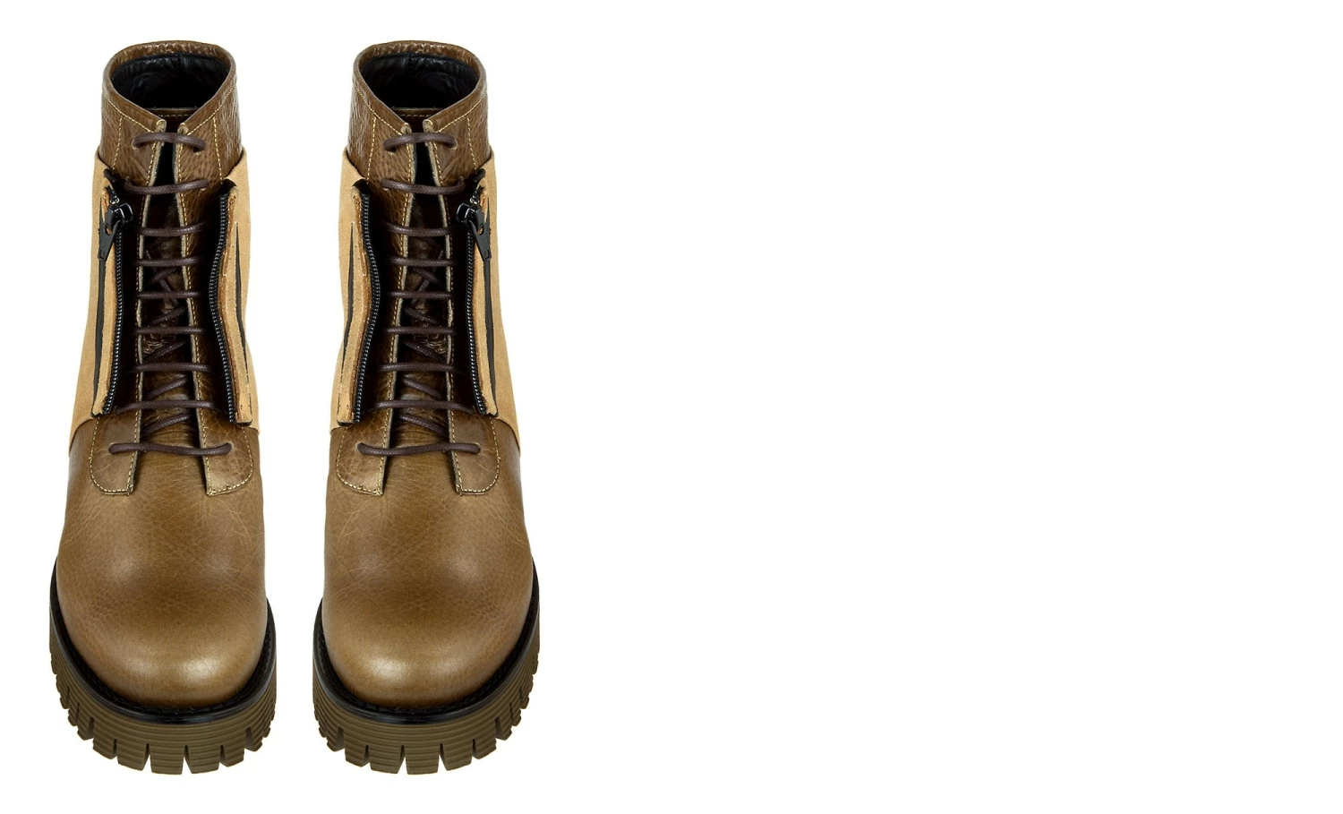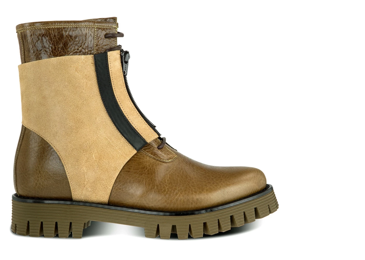 Stylish elevator boots made by hand from fine Tuscan nappa of a particular green/gray nuance, waxed calf leather with a deep sand shade and details in fine black Tuscan nappa leather. The olive green striped sole is made of super light natural rubber.