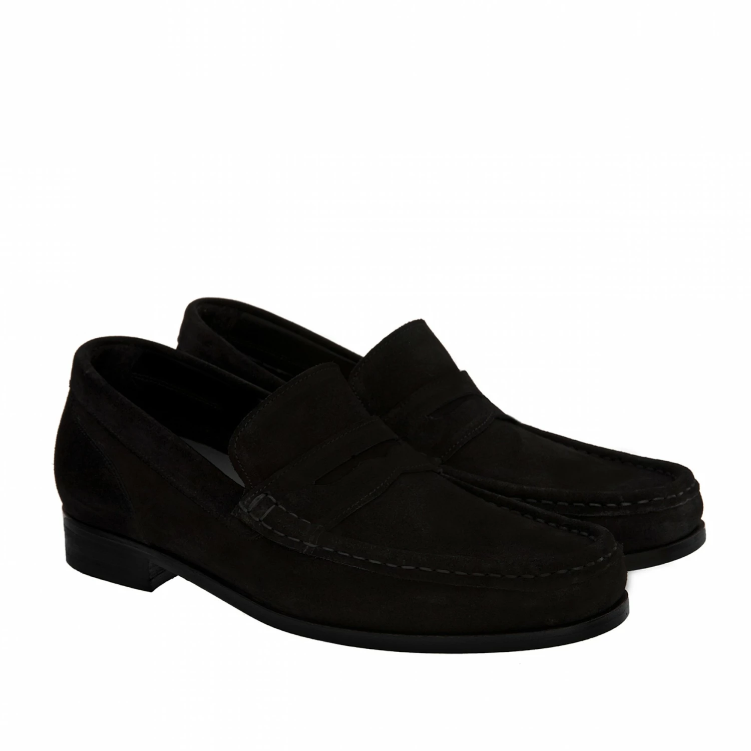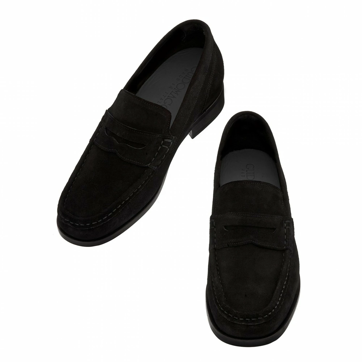Elegant elevator loafer with clamp, handmade in Italy, with upper in black soft suede calfskin, outsole in real leather assembled and sewn at sight with midsole and insole.