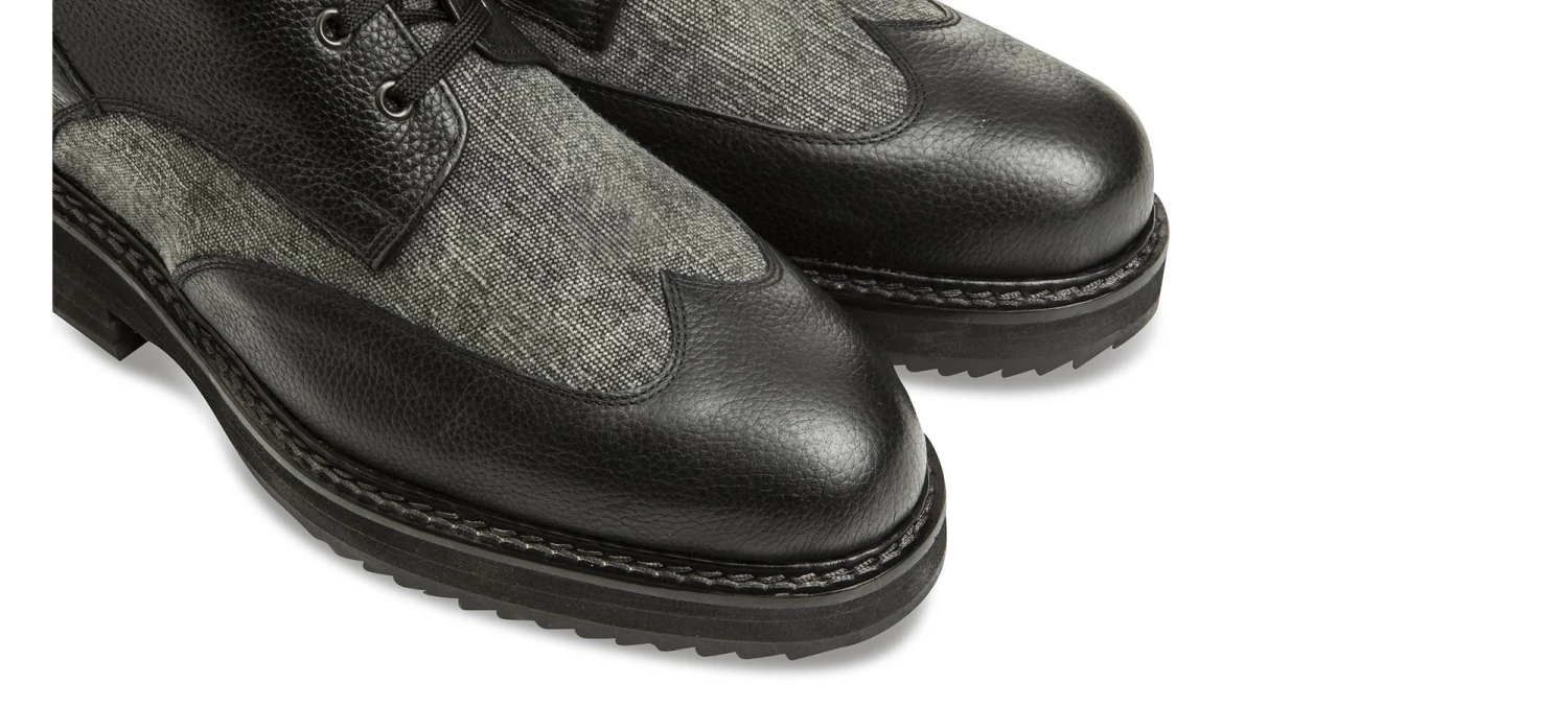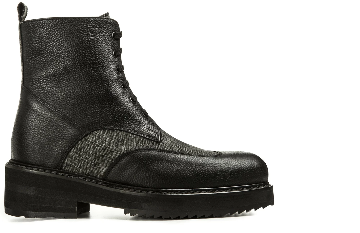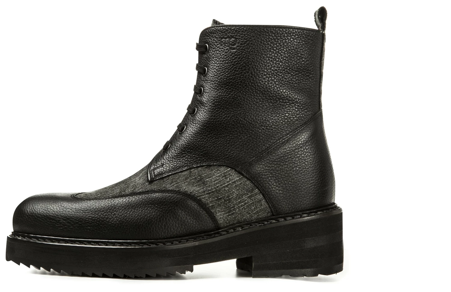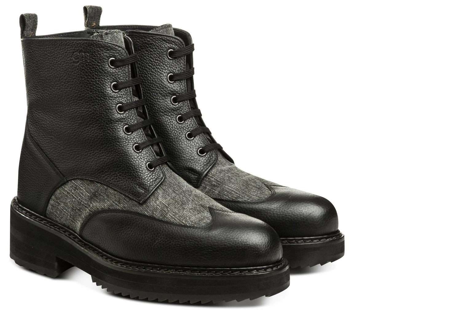 Elevator boots able to increase height from 4 (10 cm) up to 6 inches (15 cm) with upper in black tumbled calfskin and tone on tone denim fabric. The sole is made of durable super light rubber.