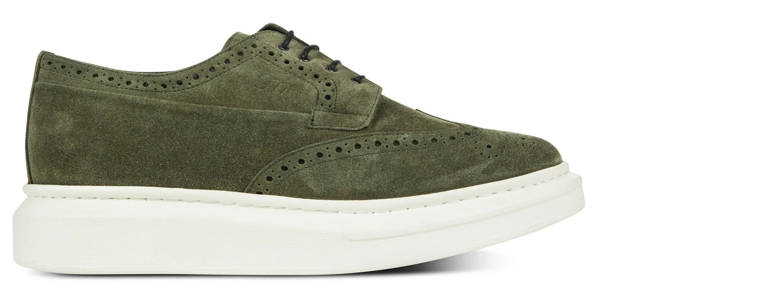 The touch of class is the derby lacing that defines its character and personality. The sole is in super-light rubber and the upper features a warm dark green suede with dovetail decoration: ideal for any season’s casual chic outfit, Campora is able to give up to 3.1” inches (8 cm) of extra height. Handmade in Italy.