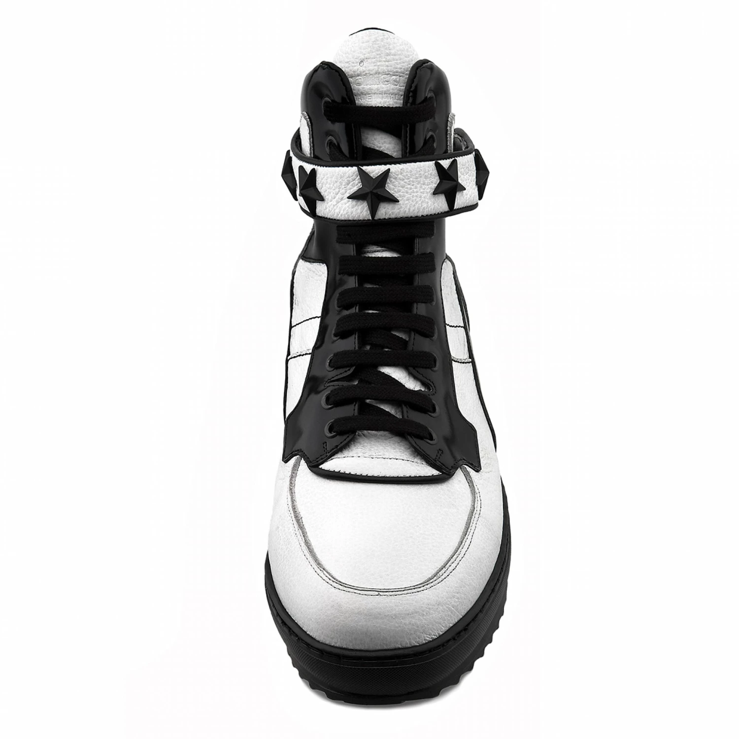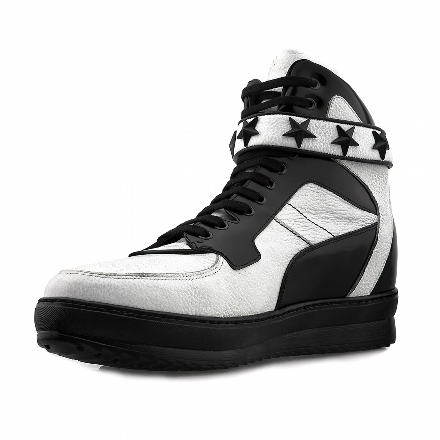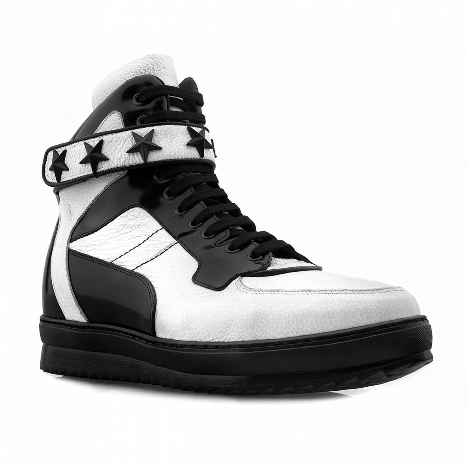 Upper in white full grain leather and shiny black calfskin. Lining in soft goatskin. Insole in genuine leather. Lightweight high quality rubber outsole anti-slip. Height increase: 2.4in(6cm), 2.75in(7cm), 3.1in(8cm) or 4 in(10cm). Hand Made in Italy