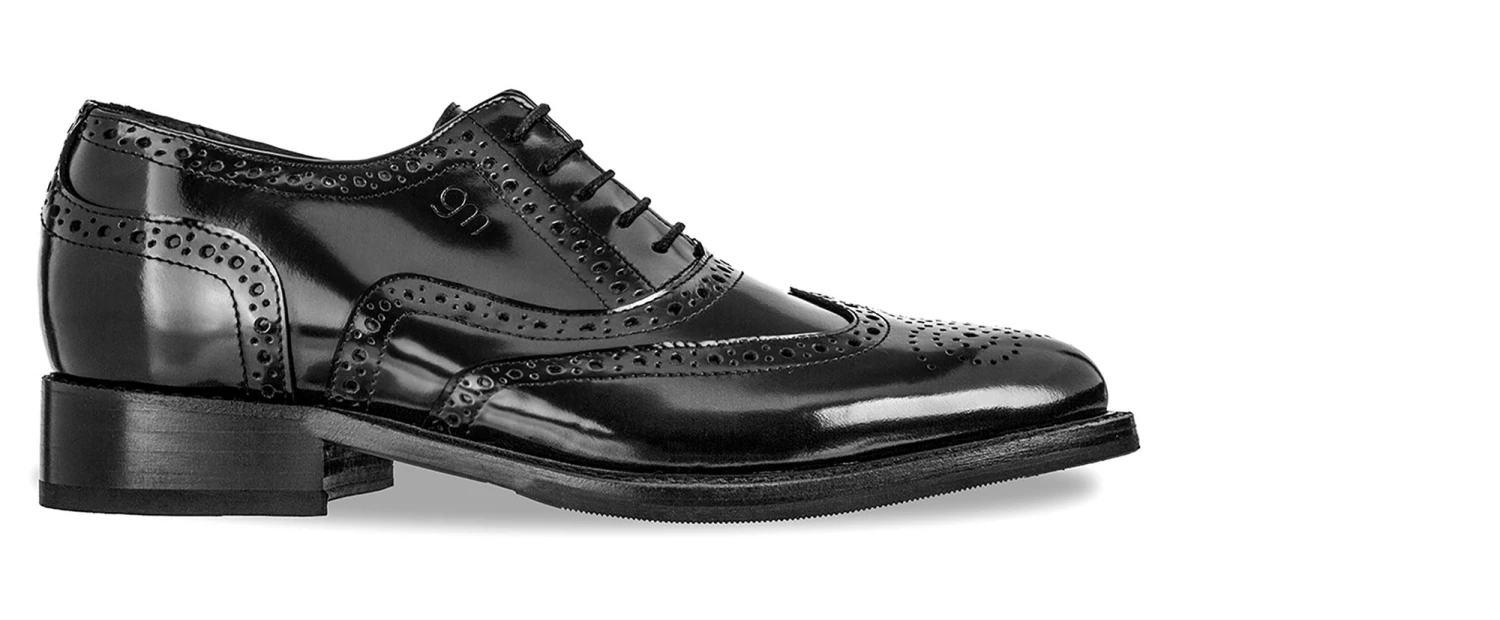 Elegant oxford shoes in black shiny calfskin featuring the unmistakable handmade brogue decoration. The sole in real leather is sewn with the Goodyear method.