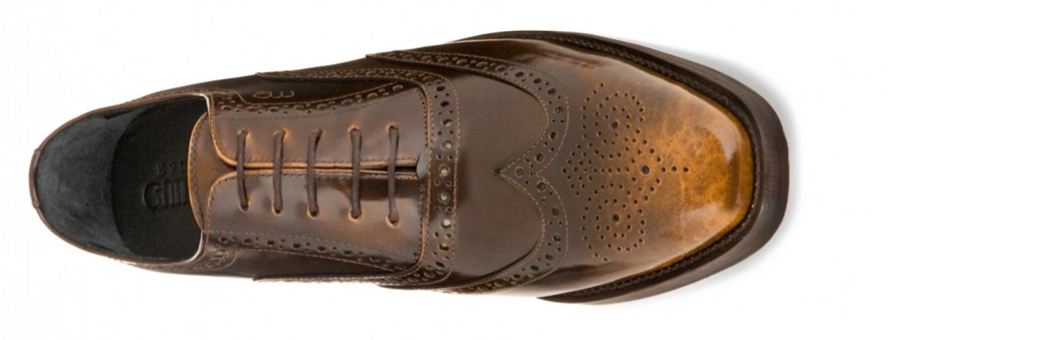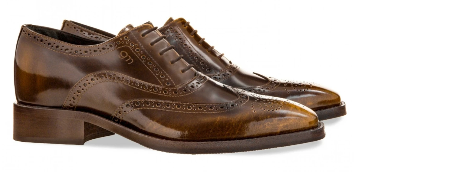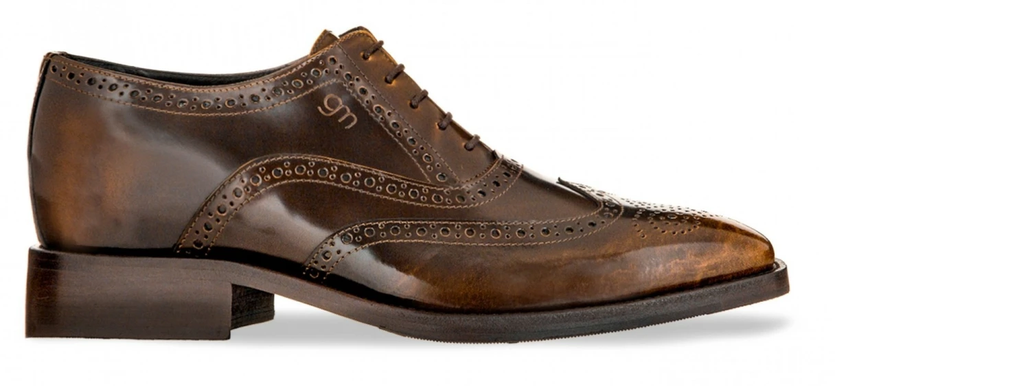Exclusive elevator oxford shoes with upper in caramel brushed shiny calfskin featuring hand-punched decorations and genuine leather sole stitched at sight, with anti-slip rubber.