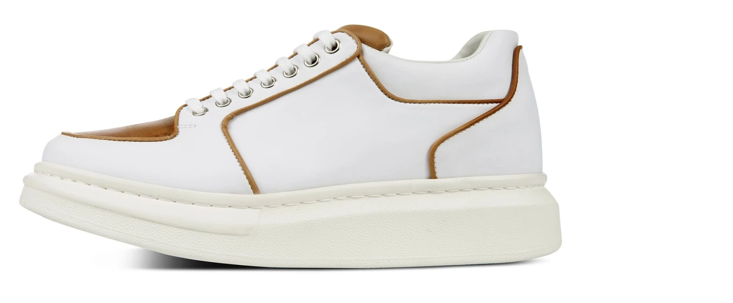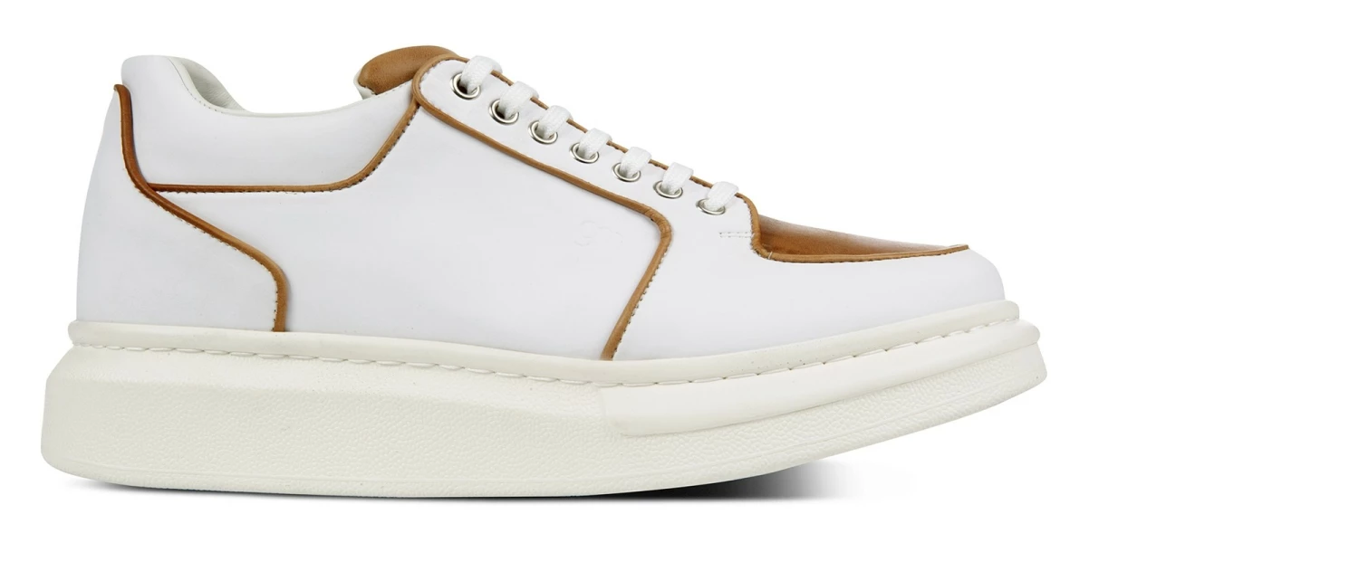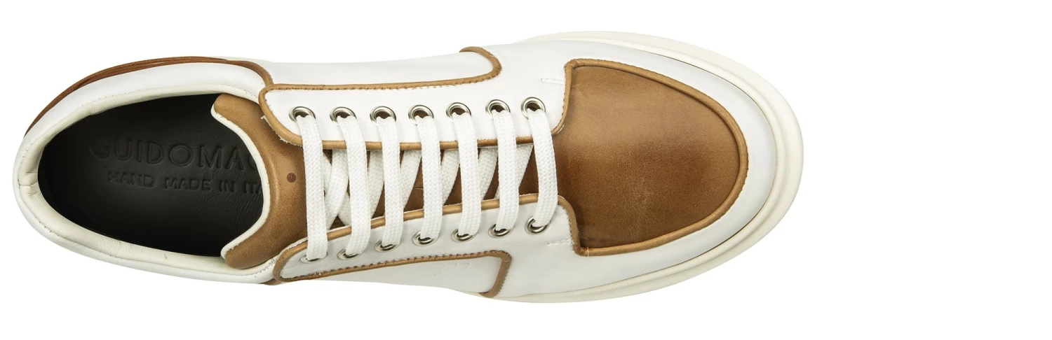 Dynamic and with curved lines, the new GuidoMaggi sneakers for men are a masterpiece of style. The upper is made of white rubberized calf leather embellished with cognac vegetable tanned full grain leather details. A very springy and fresh elevator model, ideal for any casual chic outfit.