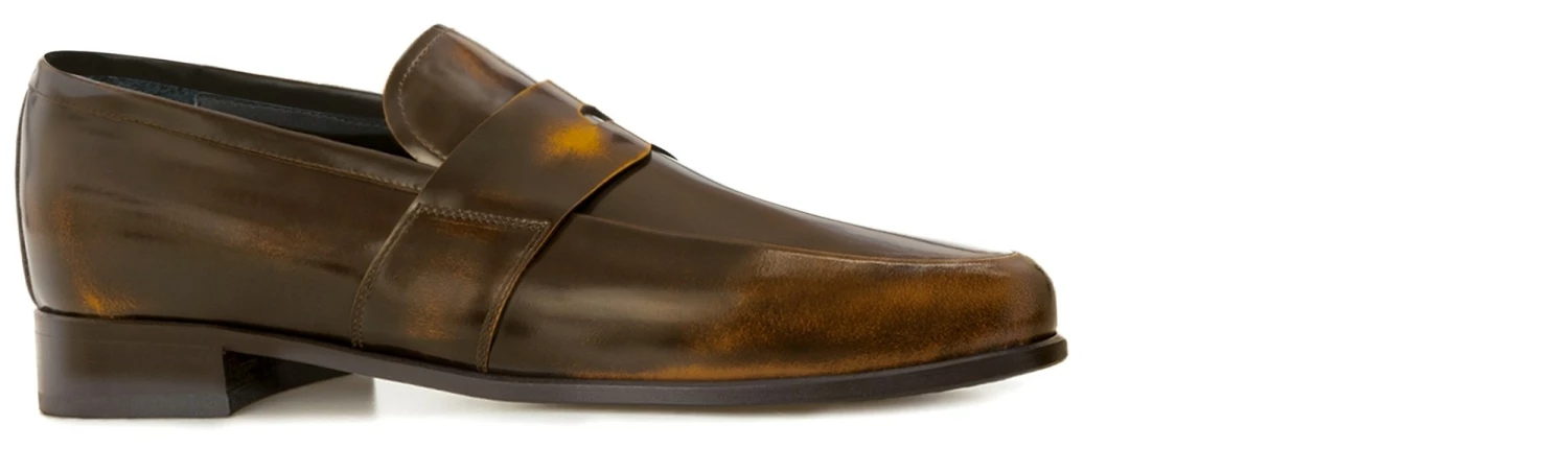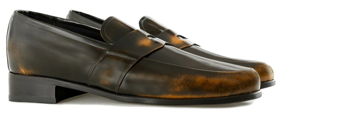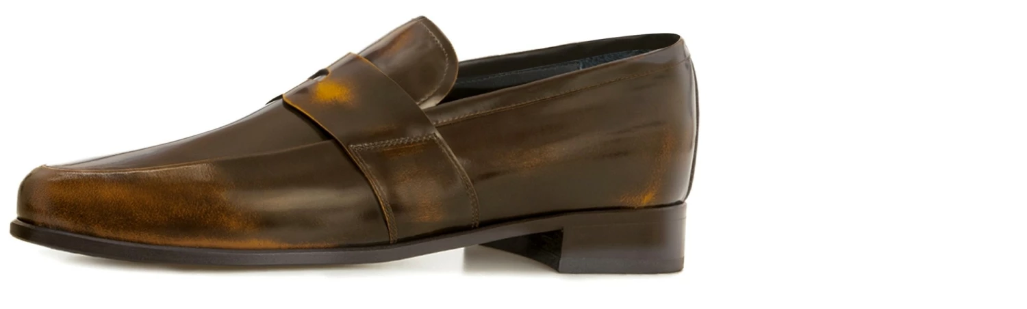 Height increasing loafers made of shiny brushed caramel calf leather and stiched leather sole with anti slip rubber. The design of this classic penny loafer has been revisited giving it a contemporary and slender silhouette.