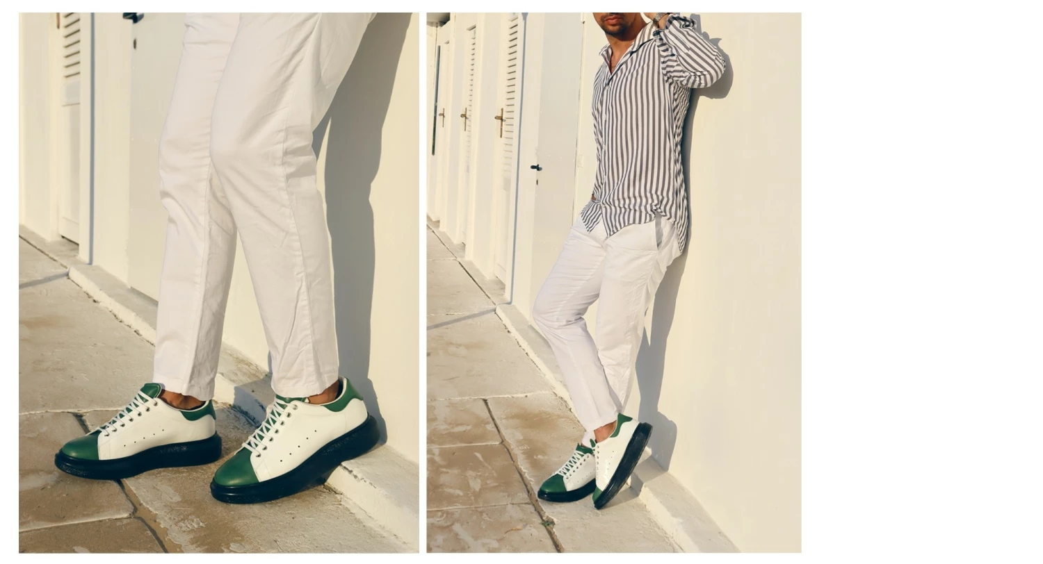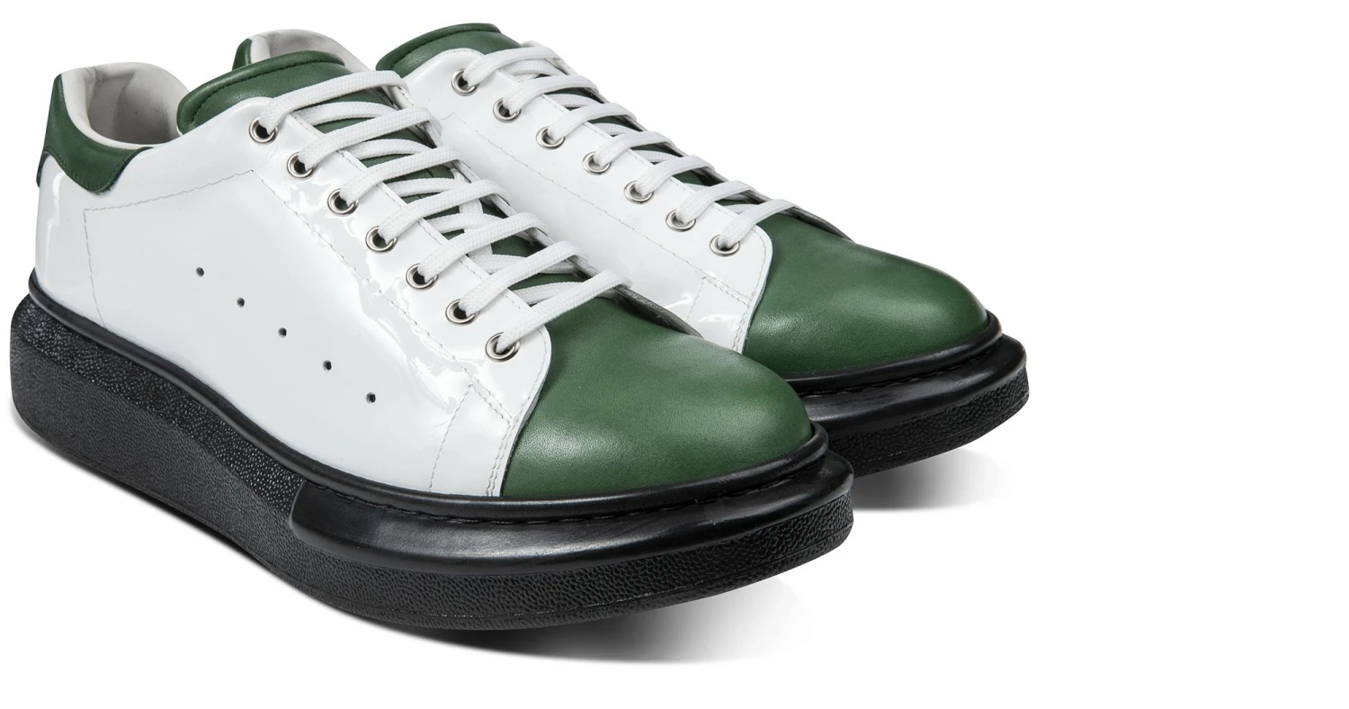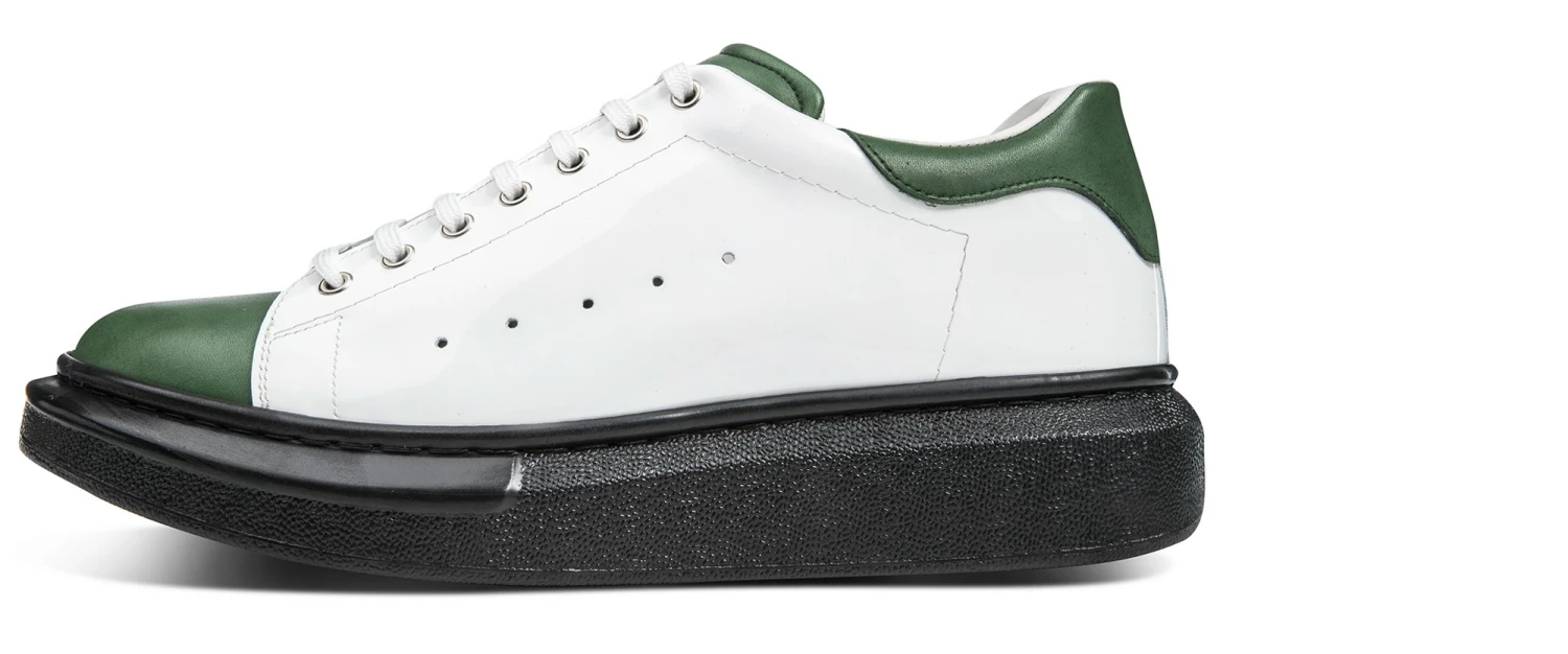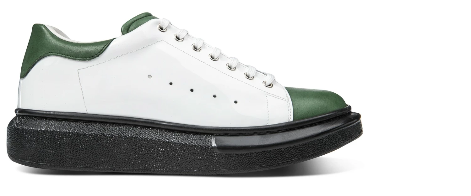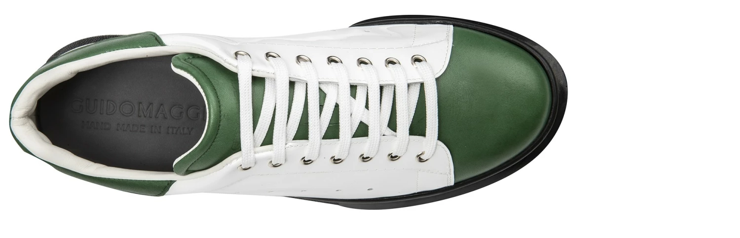 A celebration of luxury sport, the new elevator sneakers will captivate you with their innovative design and soft and versatile lines. Super-light black rubber sole, upper in a mix of white patent leather and green calfskin. Casual yet stylish, the Coimbra sneakers are able to increase the height of the wearer up to 3.1 inches (8 cm) height in total comfort and discretion. 100% made in Italy.