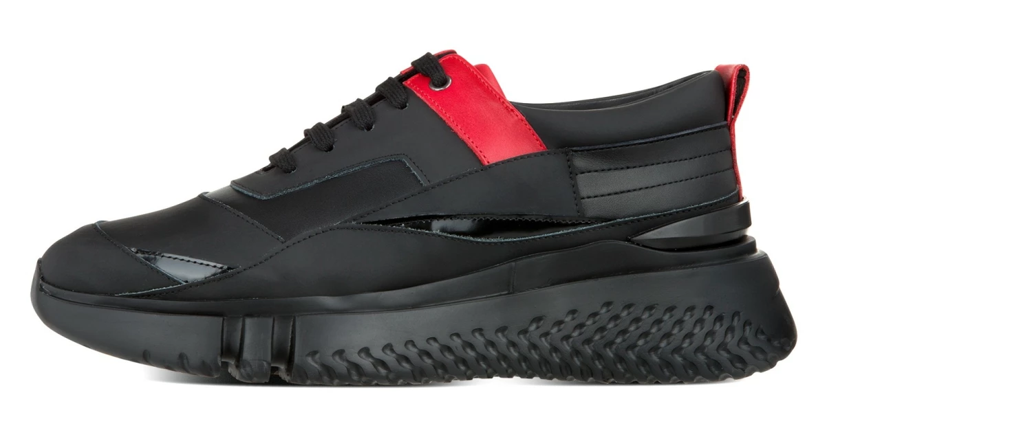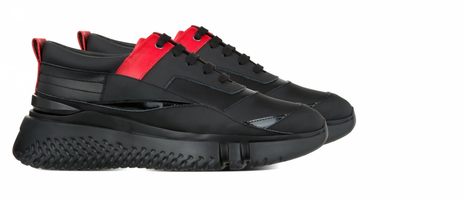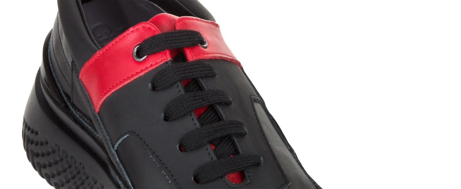 Luxury elevator sneaker inspired by the famous Rolex chronograph. The upper is in rubberized calfskin, black full-grain leather and details in red full-grain leather and shiny calfskin. The irregular sole is made of super-light natural rubber.