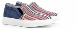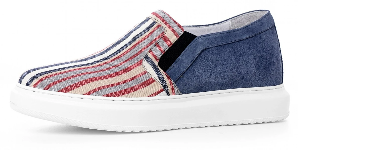 Unique elevator boat slip-on sneakers made of striped fabric at the front upper and suede calfskin at the back.