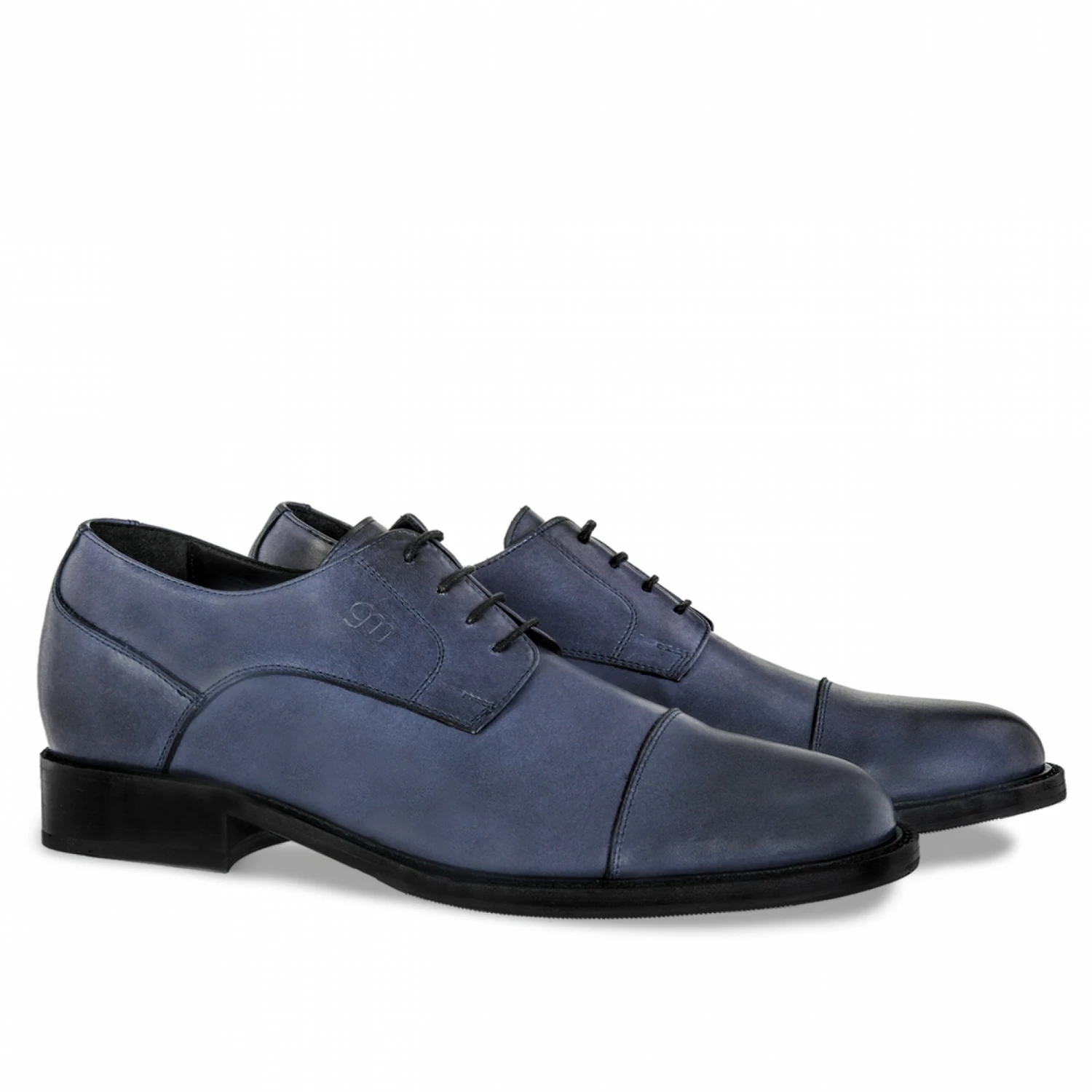 Luxury elevator derby shoes with upper in hand-painted calfskin featuring a coral blue colour with black shades and stiched leather sole with anti slip rubber.