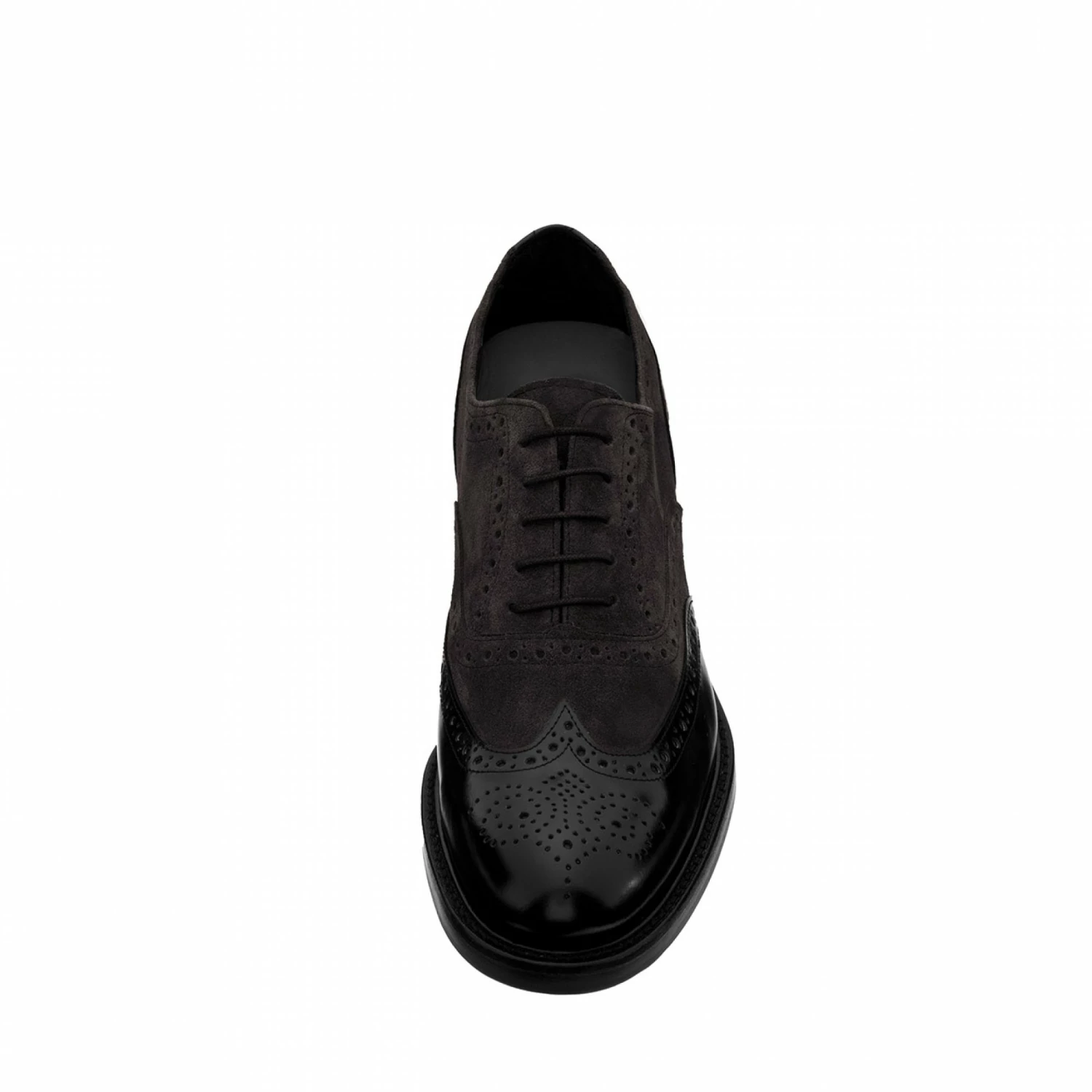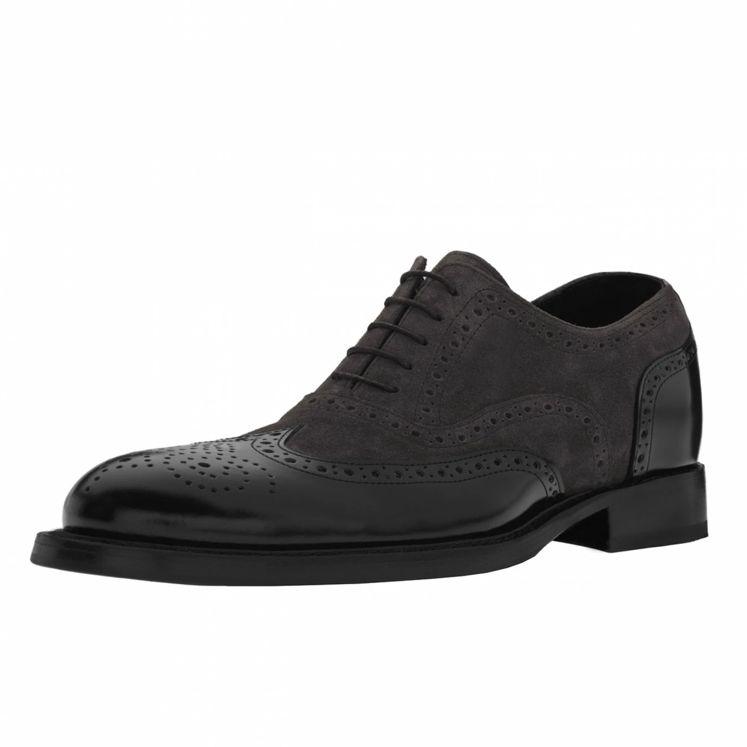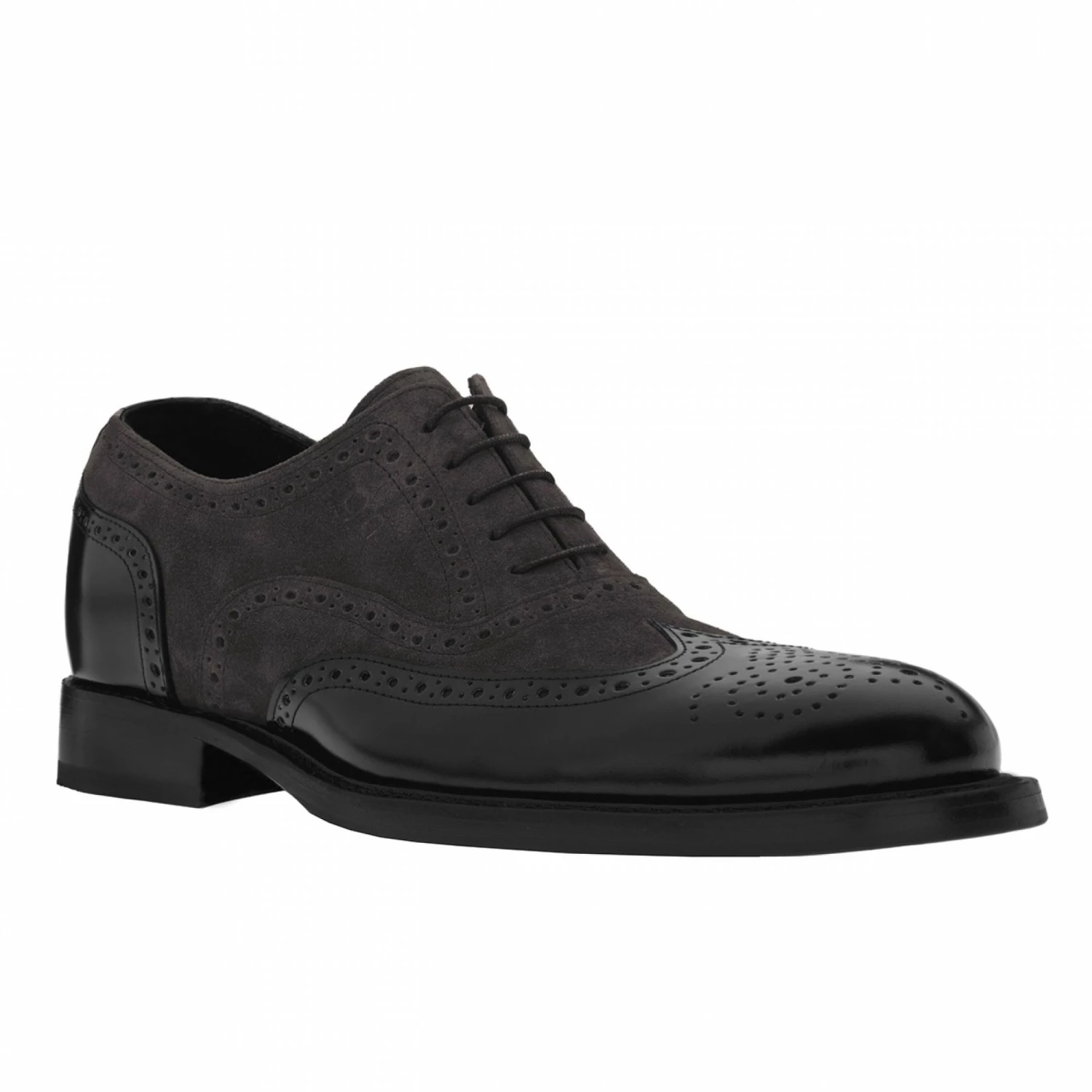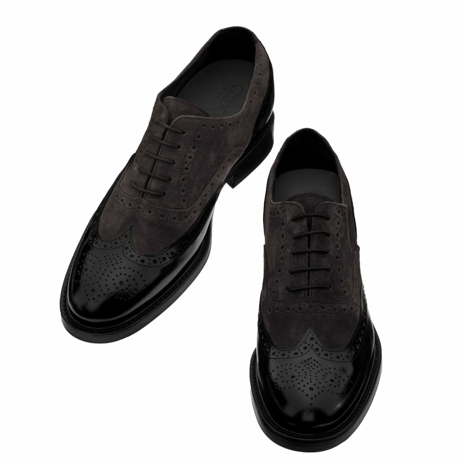 A dandy style, fine leathers, comfort and handmaking are the characteristics of this Oxford shoe by Guidomaggi. Refined upper in dark gray suede and black shiny calfskin punched by hand to get the brogue perforations.