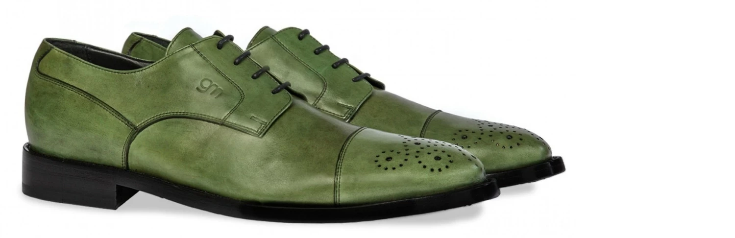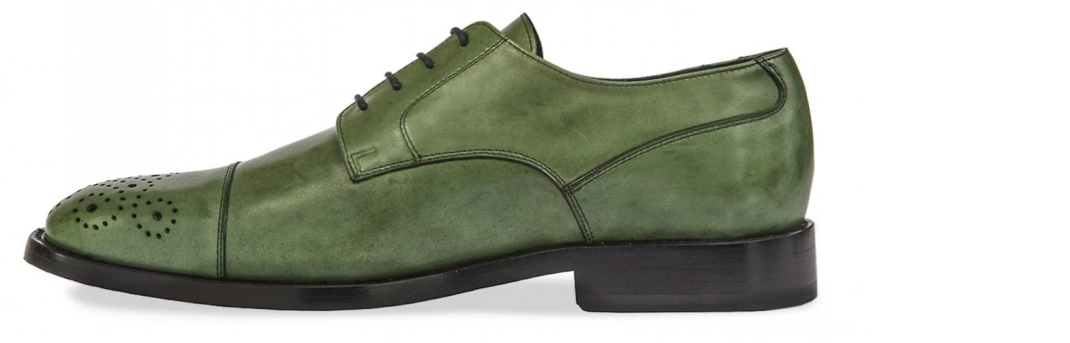 Sartorial design: elevator derby shoes with upper in hand-painted calf leather featuring harmonious shades of green, hand-punched decoration on the toe and stiched leather sole with anti slip rubber.
