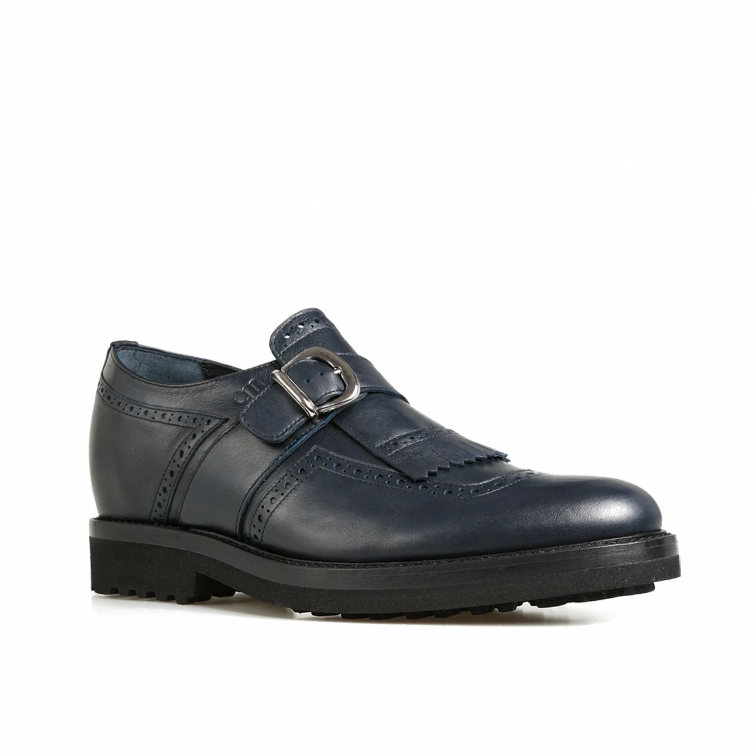Versatile and modern elevator monk strap shoes with upper in dark blue full-grain leather, embellished with elegant tone-on-tone fringes. The sole in natural rubber is stitched at sight.
