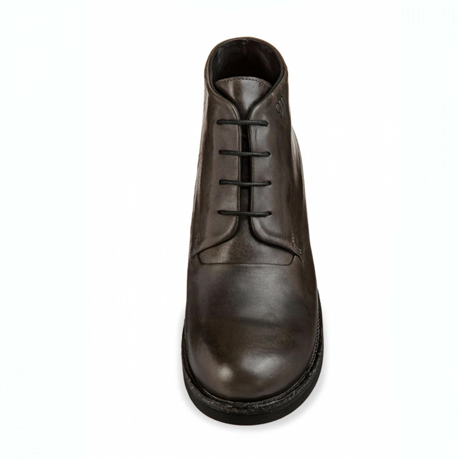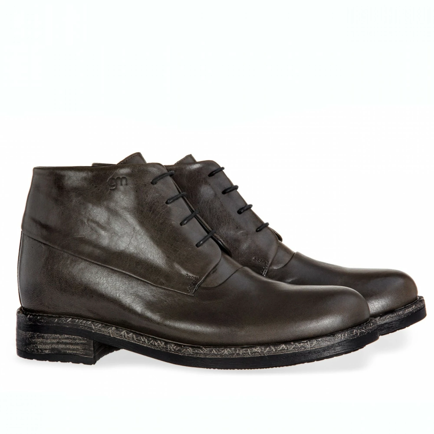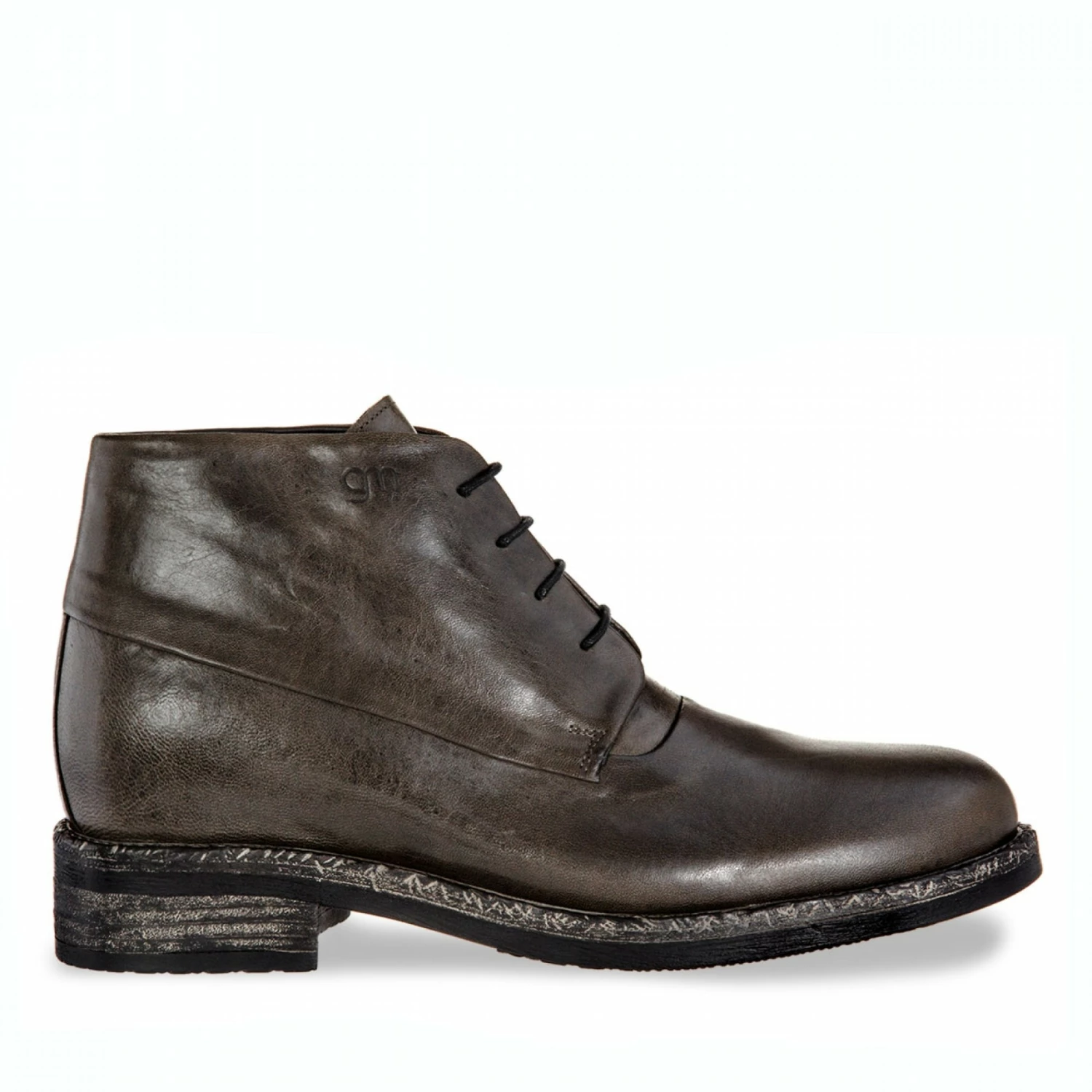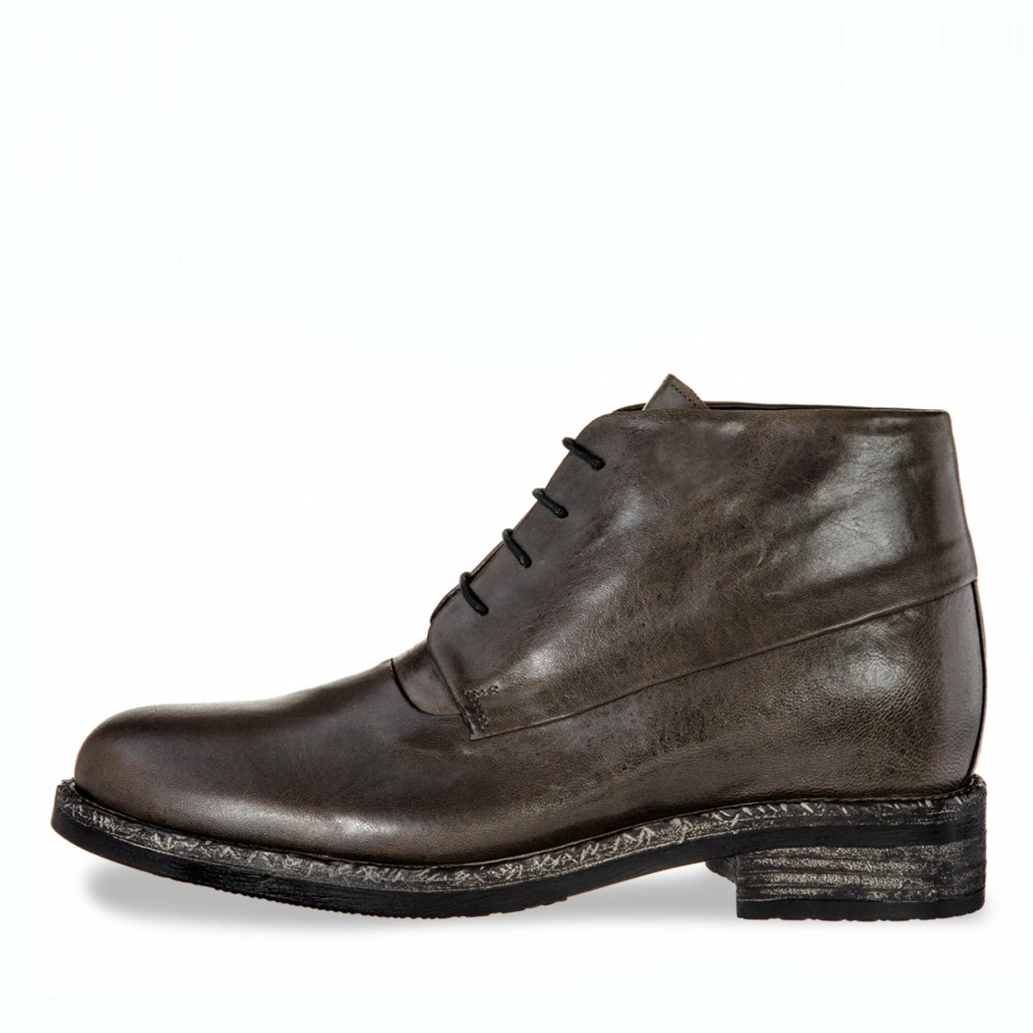 Modern reinterpretation of the classic elevator ankle boot with upper in shiny gray vintage-effect calfskin featuring dark green colour tones. The retro effect sole is in natural rubber.