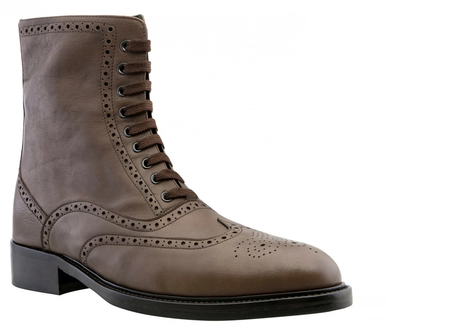 Upper in brown full grain leather. Full soft leather lining. Upper leather, outsole and midsole are sewn at sight. Insole and midsole in genuine leather. Leather heel with special anti-slip rubber. Cotton waxed shoe laces. Available with: Handcrafted leather outsole with special anti-slip rubber or High quality rubber sole anti-slip. Height increase 2.75inches(7cm) or 3.1inches(8cm) or 4 inches(10cm). Hand Made in Italy