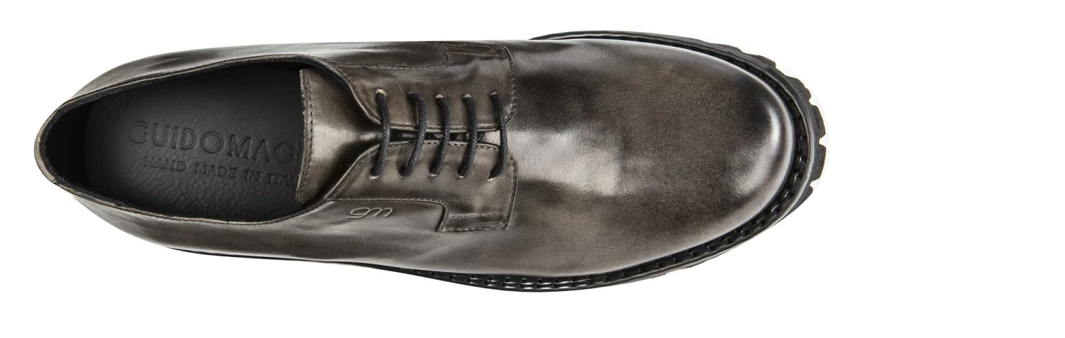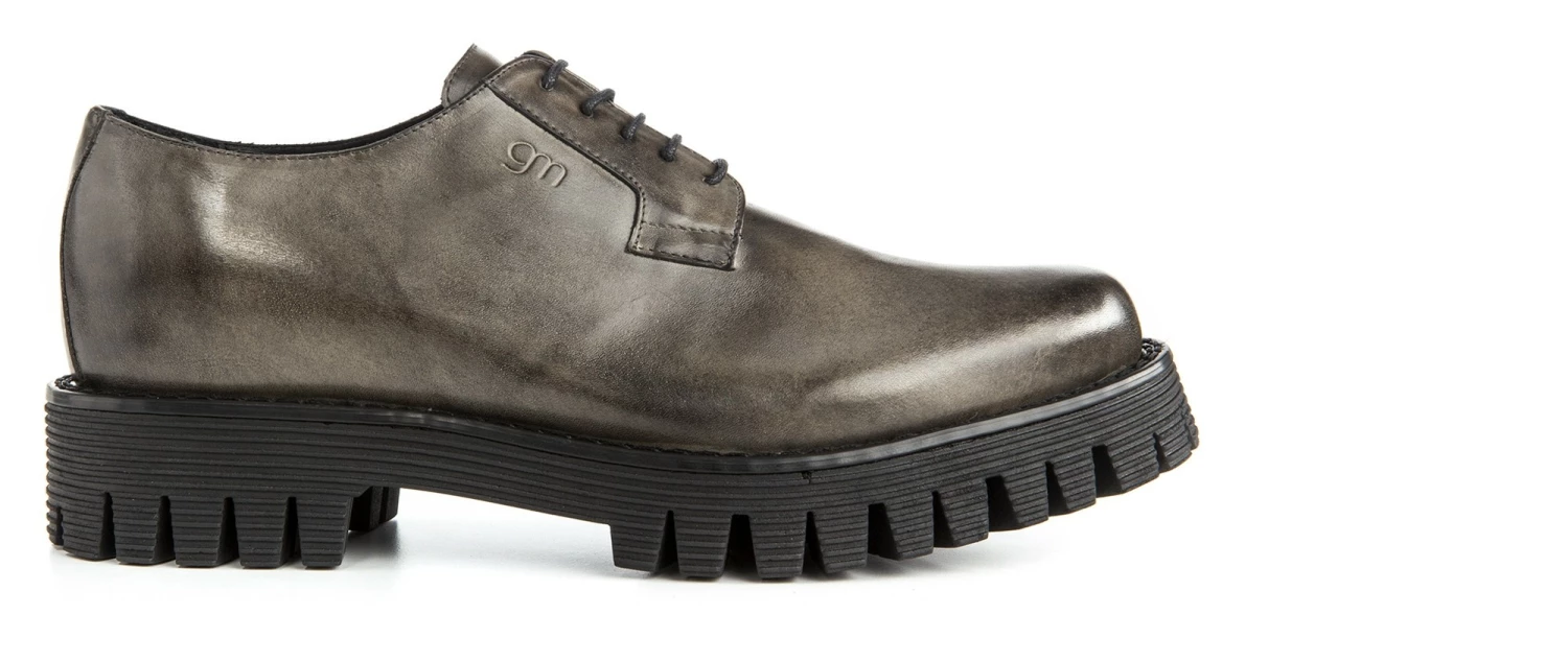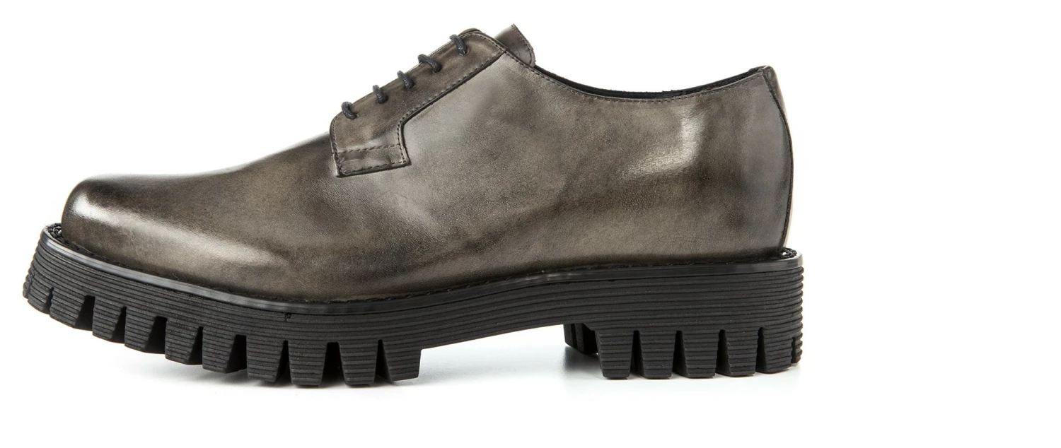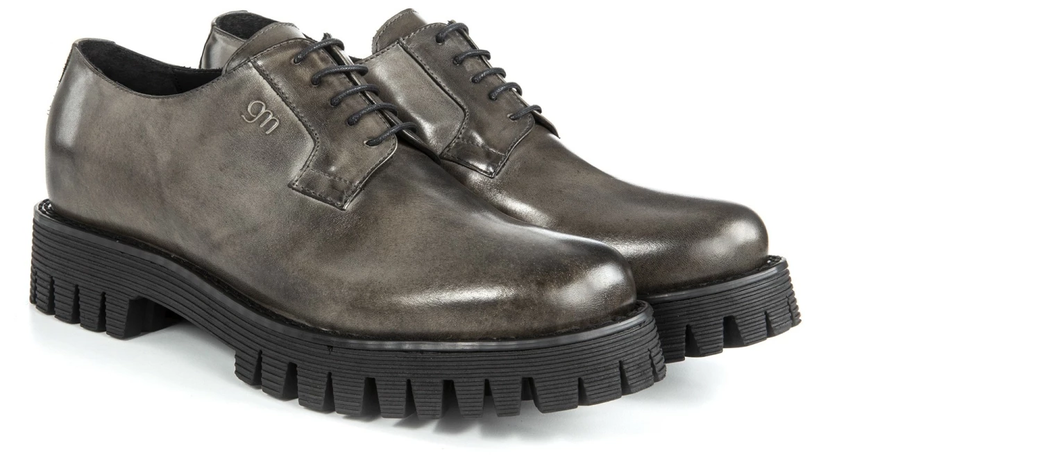 Elevator derby shoe with a casual and contemporary design made of fine burnished gray full-grain leather buffed by hand and lug striped black sole in natural rubber.