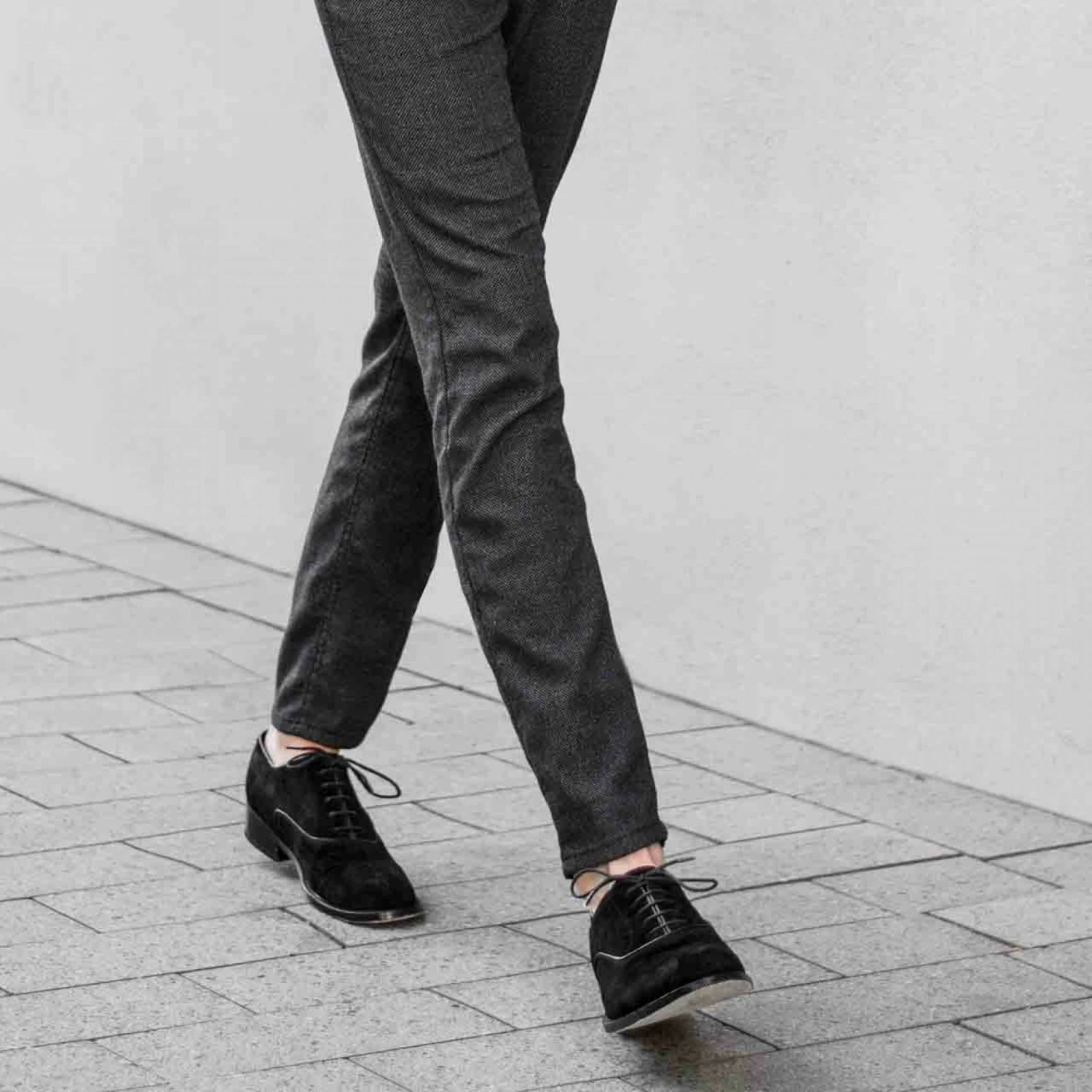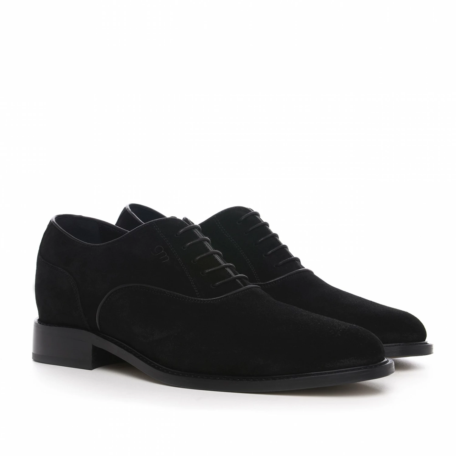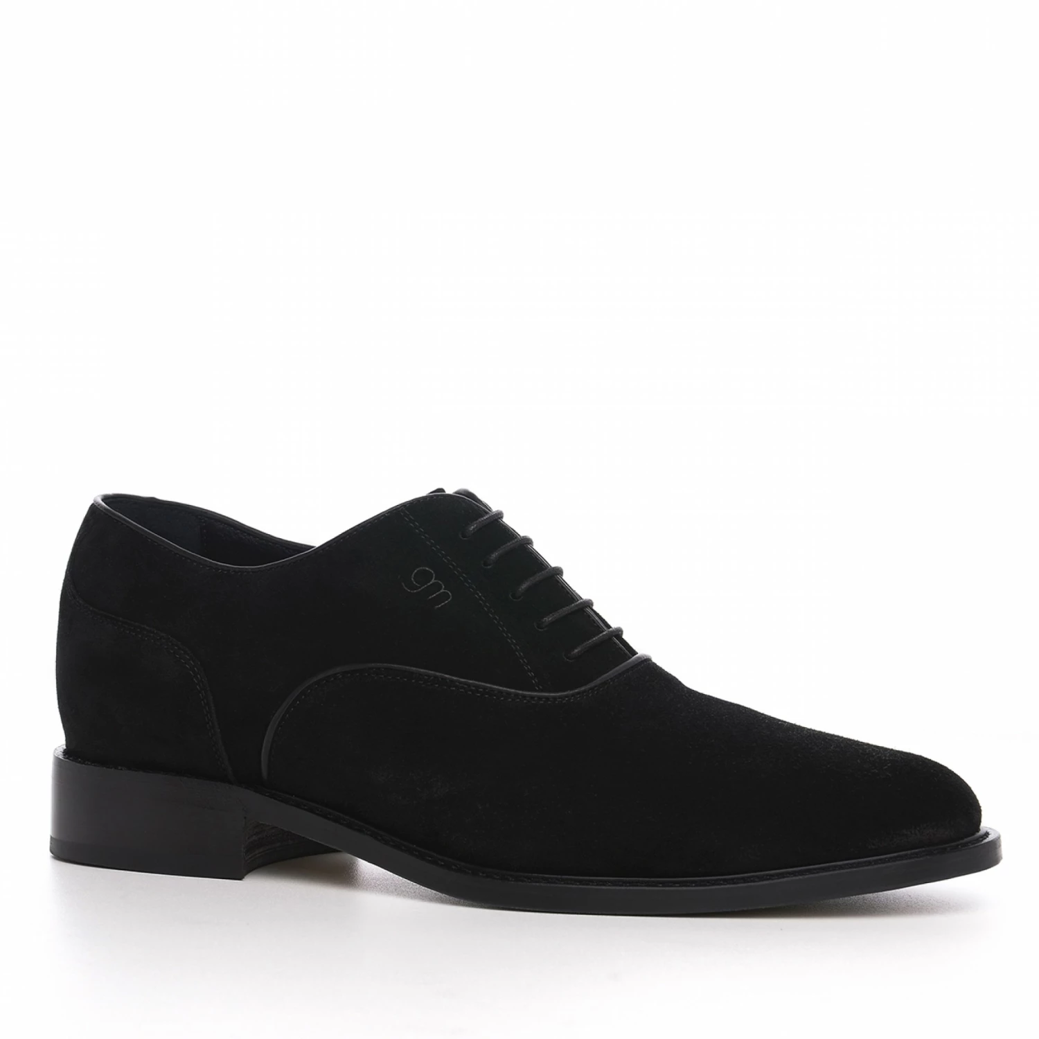 Exclusive elevator Oxford shoe handmade in Italy featuring Goodyear welted real leather sole and upper in elegant black suede. The inner elevator system can be chosen from 2.4 (6 cm) up to 3.1 inches (8 cm) depending on needs.