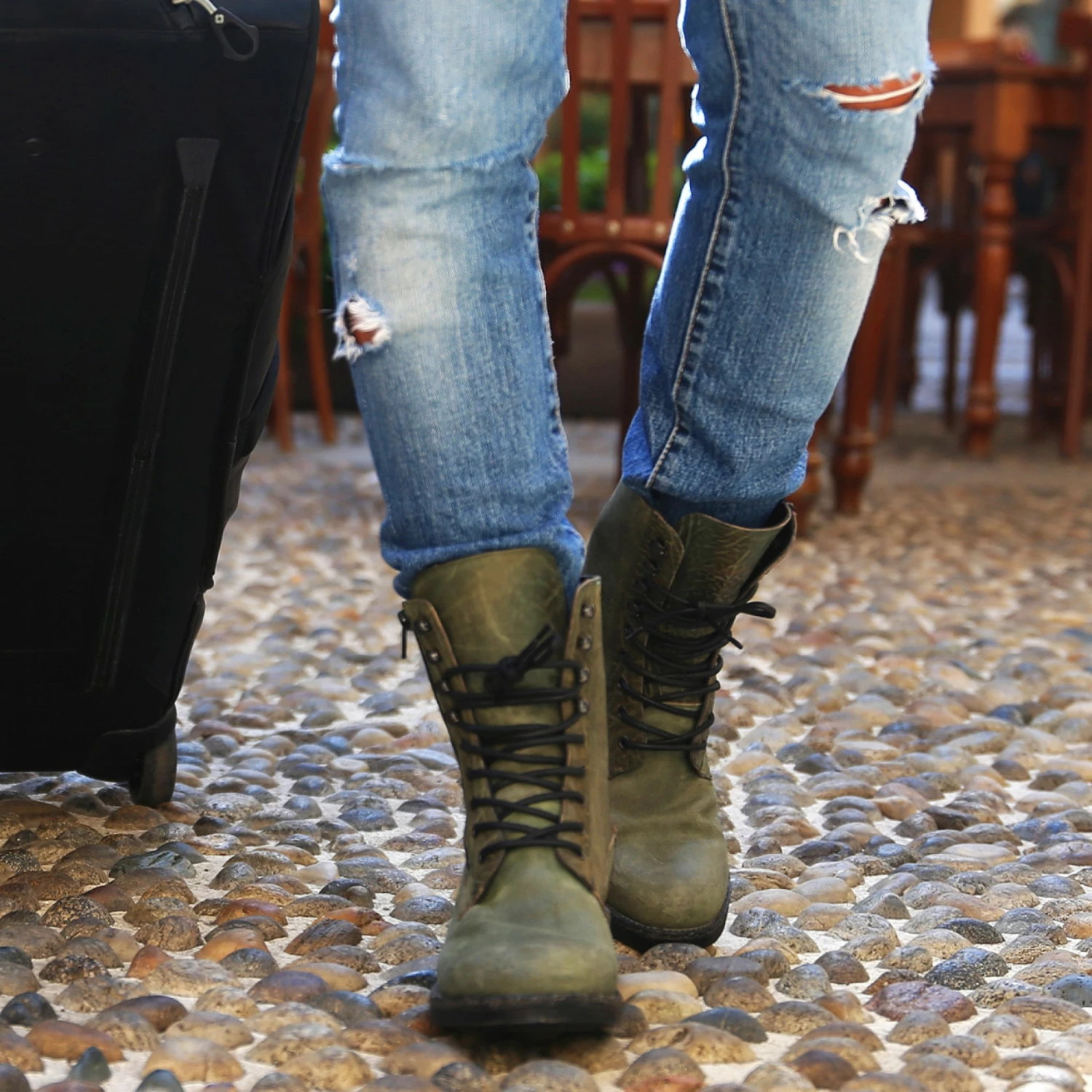 Handcrafted elevator boots with upper in fine dark green Cordovan leather featuring a natural vintage look, side zip and laces. Sole in natural rubber.