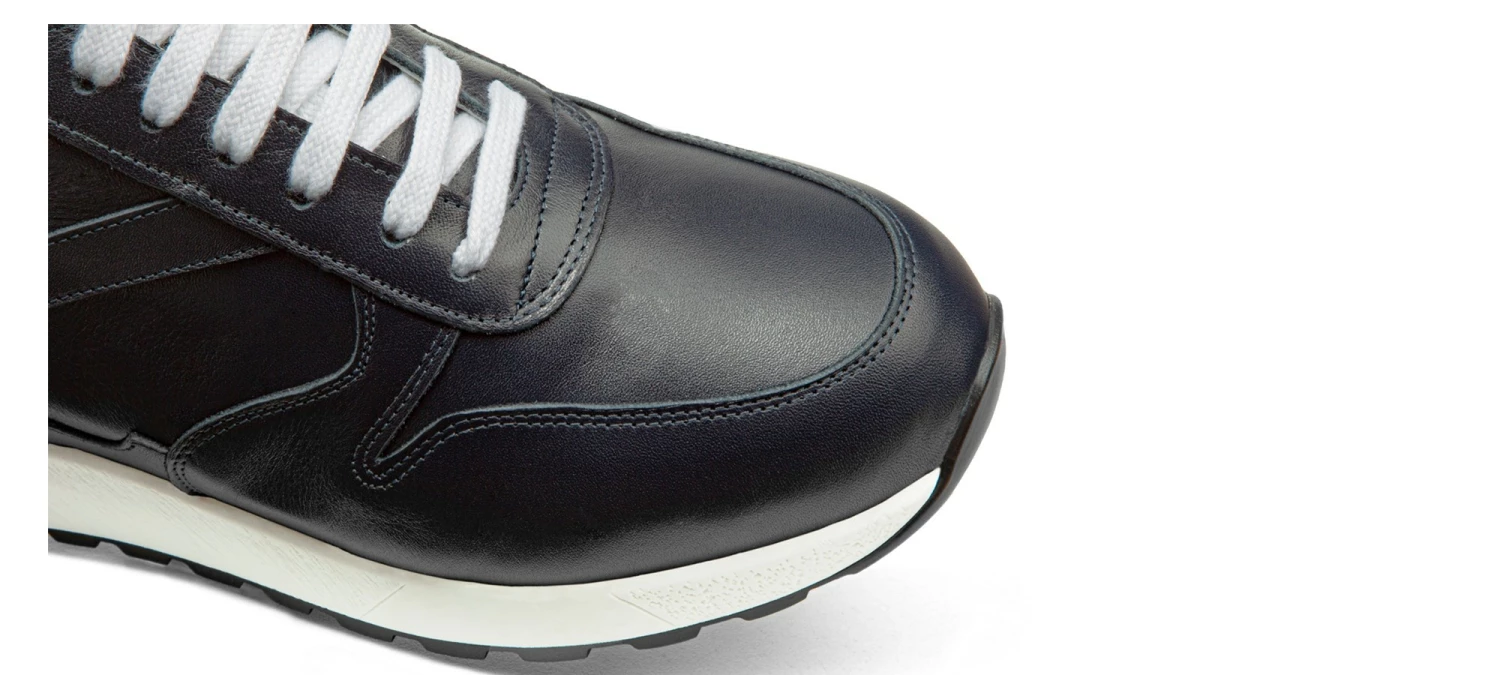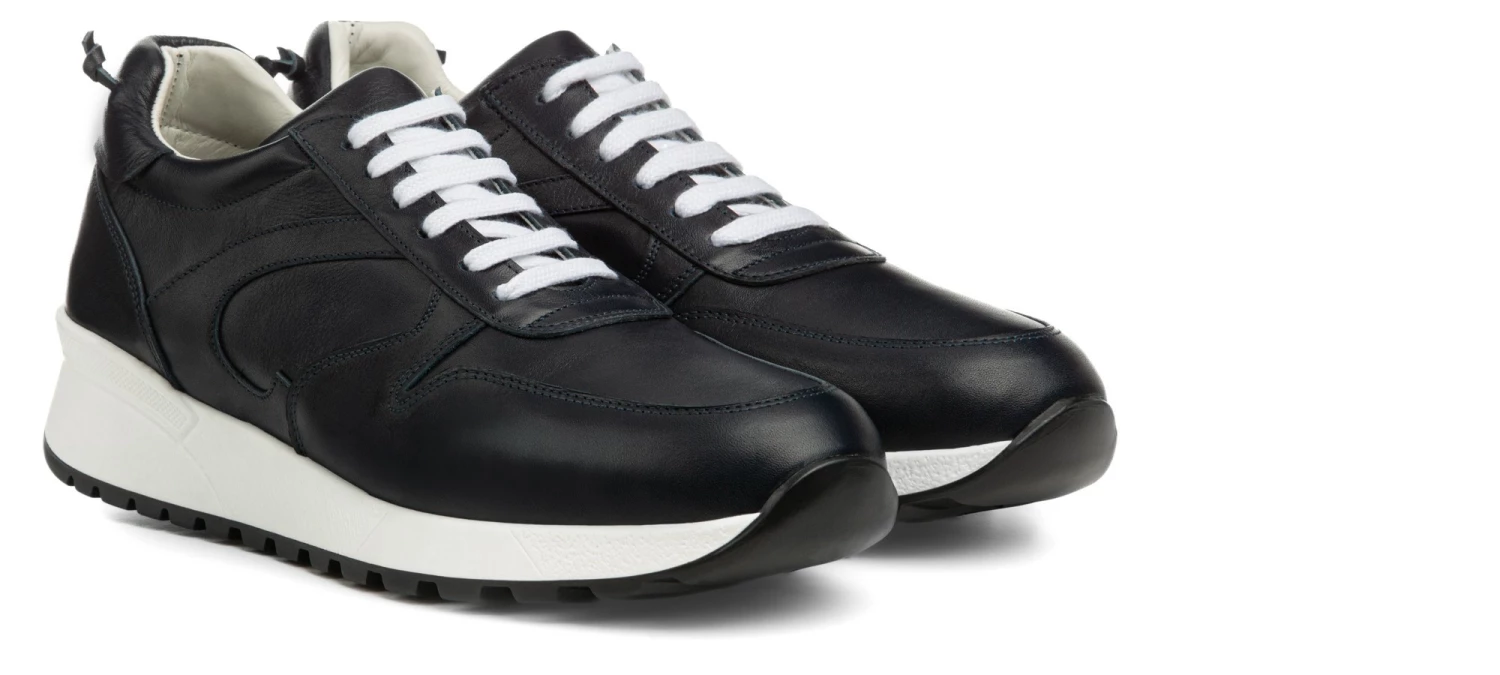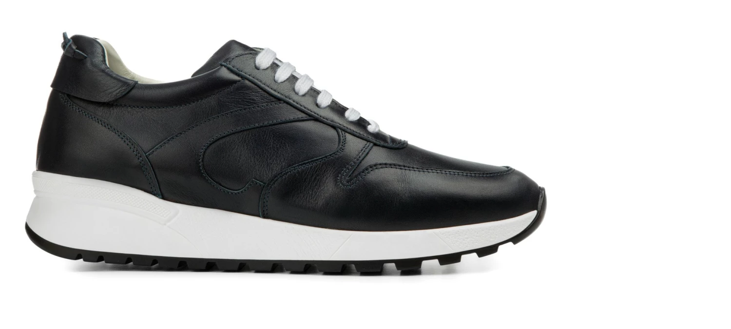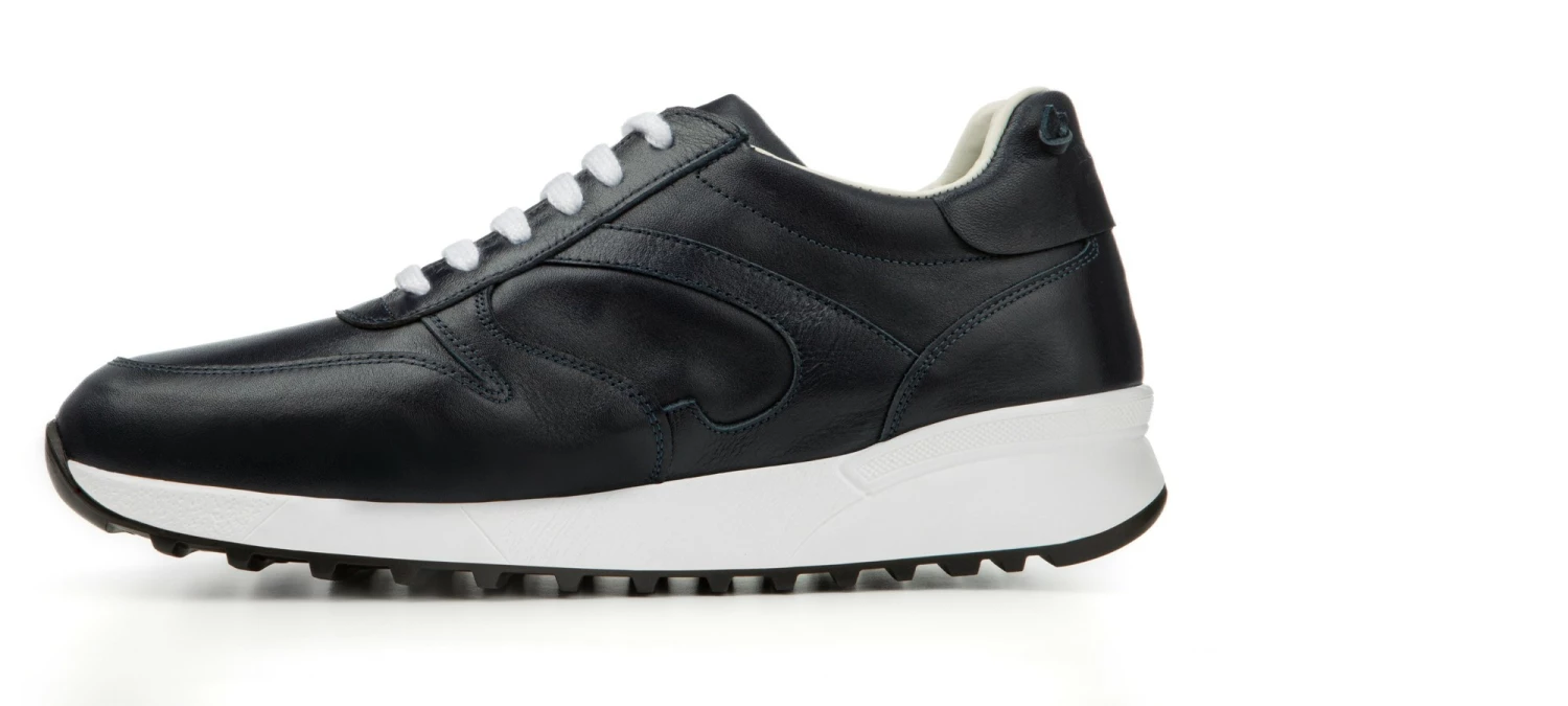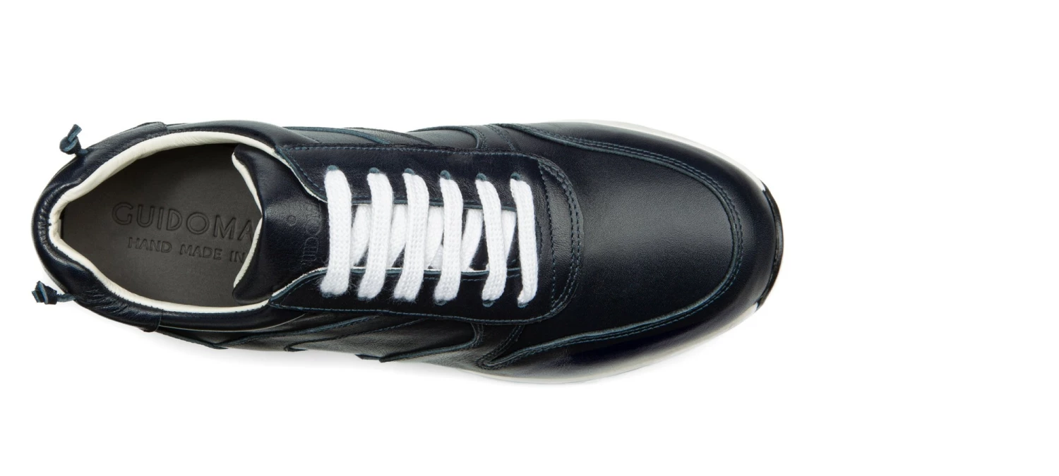 Luxury elevator sneakers, handcrafted, characterized by the refined upper in midnight blue full-grain calfskin.
