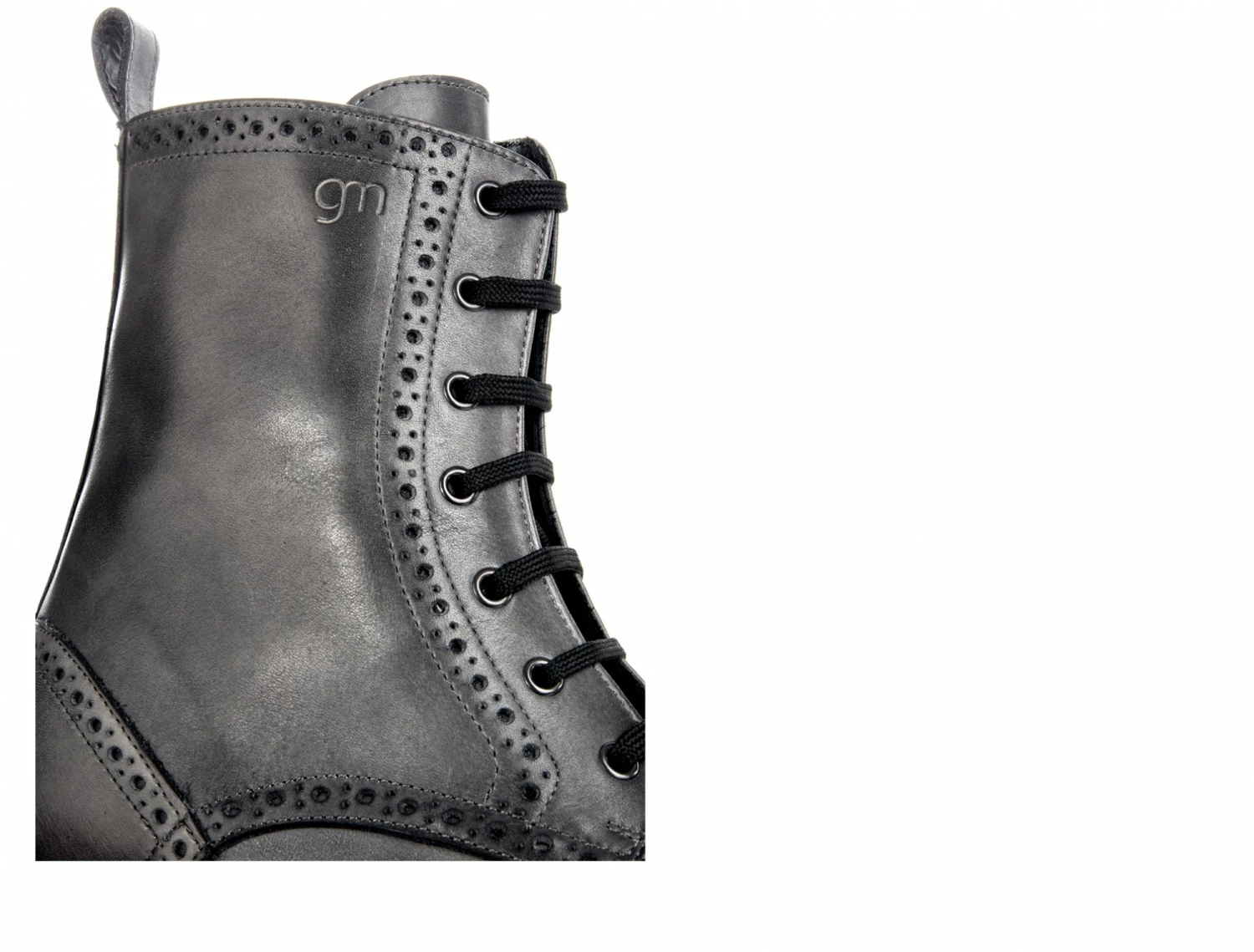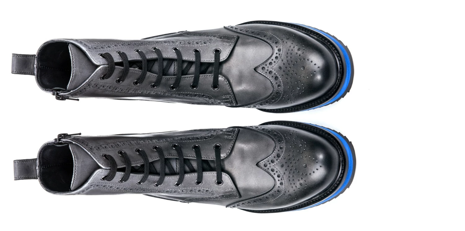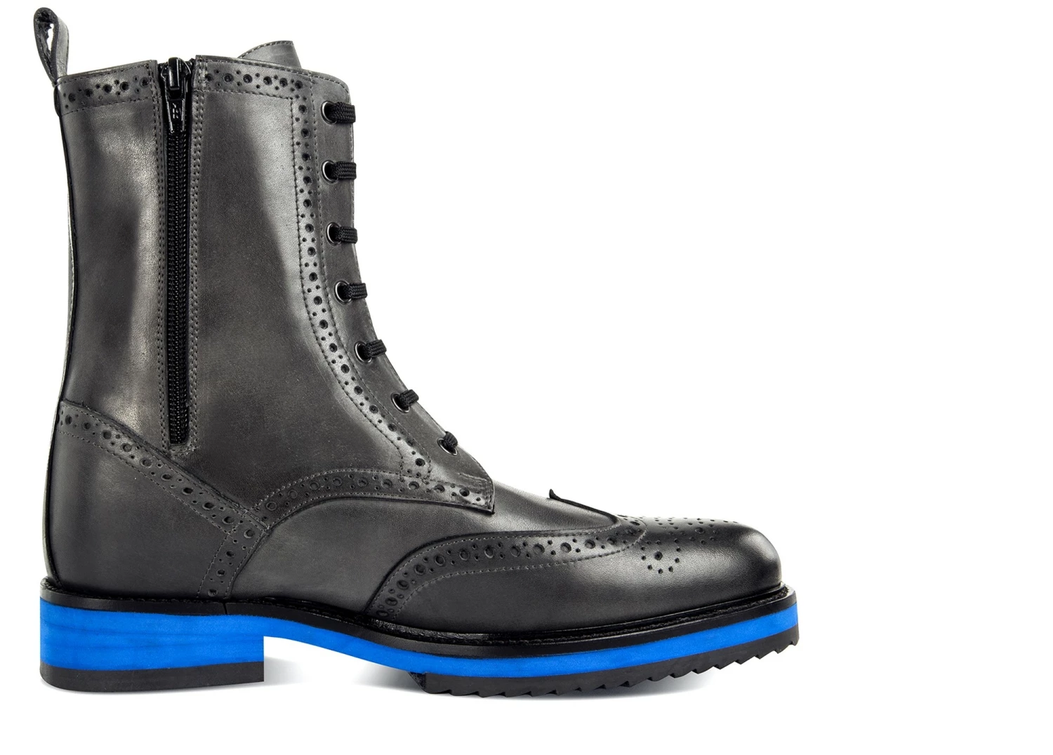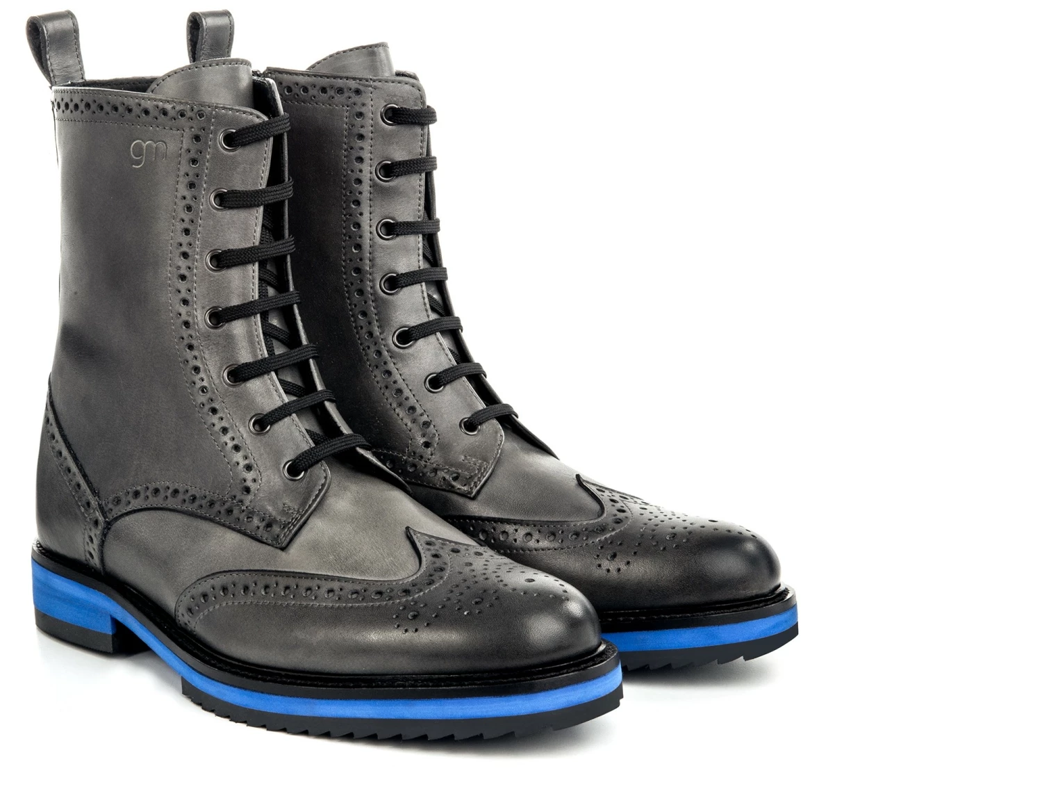 Elevator boots with a contemporary style featuring upper made of fine burnished gray full-grain leather buffed by hand and full brogue decoration. The two-tone blue and black sole made of ultralight natural rubber gives a unique chromatic contrast.
