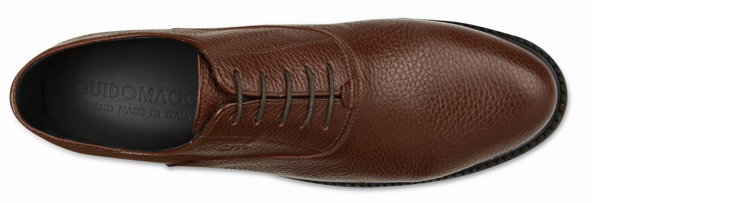 An elevator oxford from the brand new series by GuidoMaggi. It has the upper in fine deerskin: an excellent type of leather, characterized by a natural softness and breathability, flexible and highly durable. In brown, with a dark brown sole in 100% Italian leather, it adds up to 3.1″ in total comfort and discretion. Handmade in Italy.