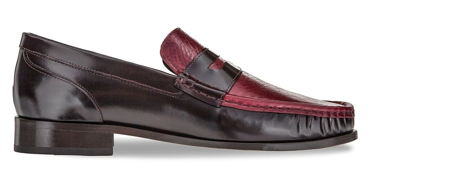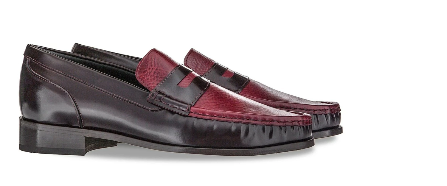 Elegant elevator loafers featuring a burgundy upper handcrafted from two fine leathers: brushed calfskin and soft Tuscan nappa leather. The dark brown leather sole is Goodyear stitched.