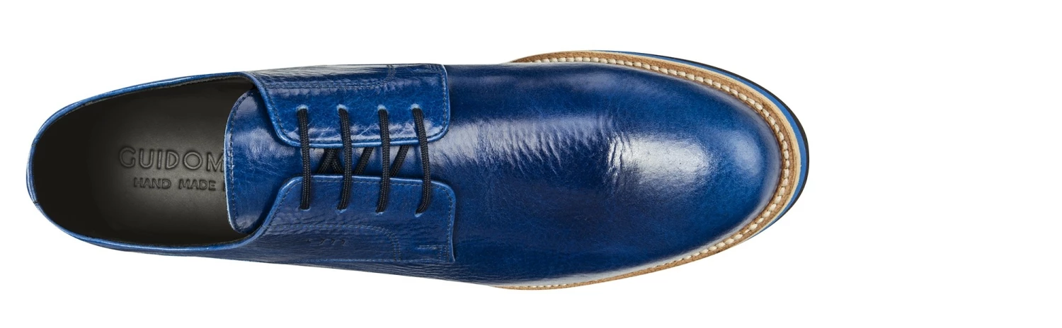 Derby elevator shoes in Tuscan napa leather, with a wrinkled effect that enhances its strong character. The bright blue colour makes it captivating and incredibly trendy. .