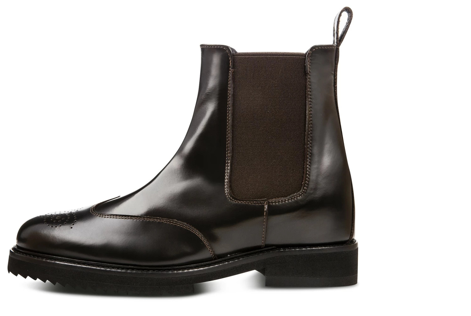 A Chelsea-inspired ankle boot with smooth dovetail and a distinctive flower toe. Light, resistant and comfortable, this ankle boot has a dark brown brushed calfskin upper and a micro sole with toothed tread and elastic silk.