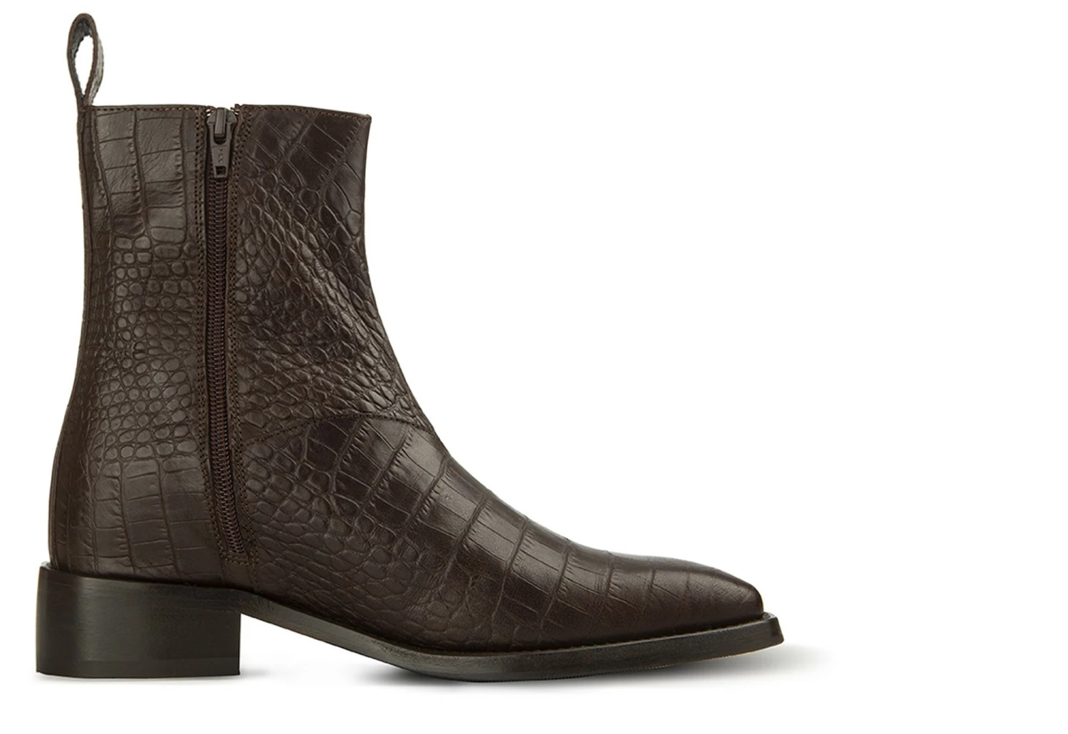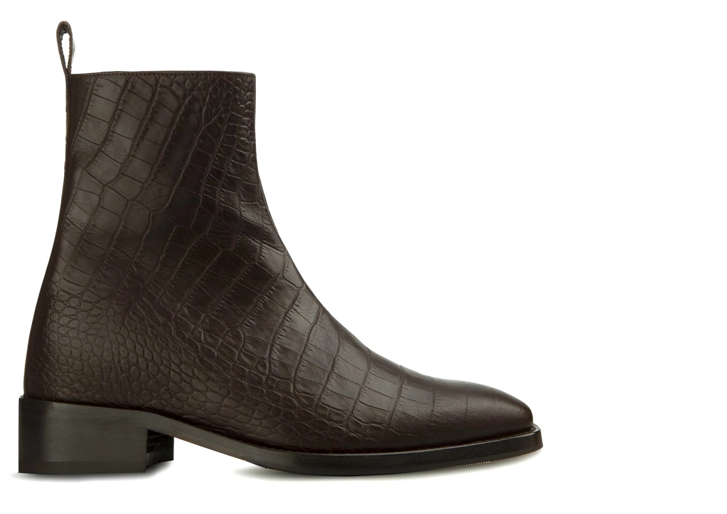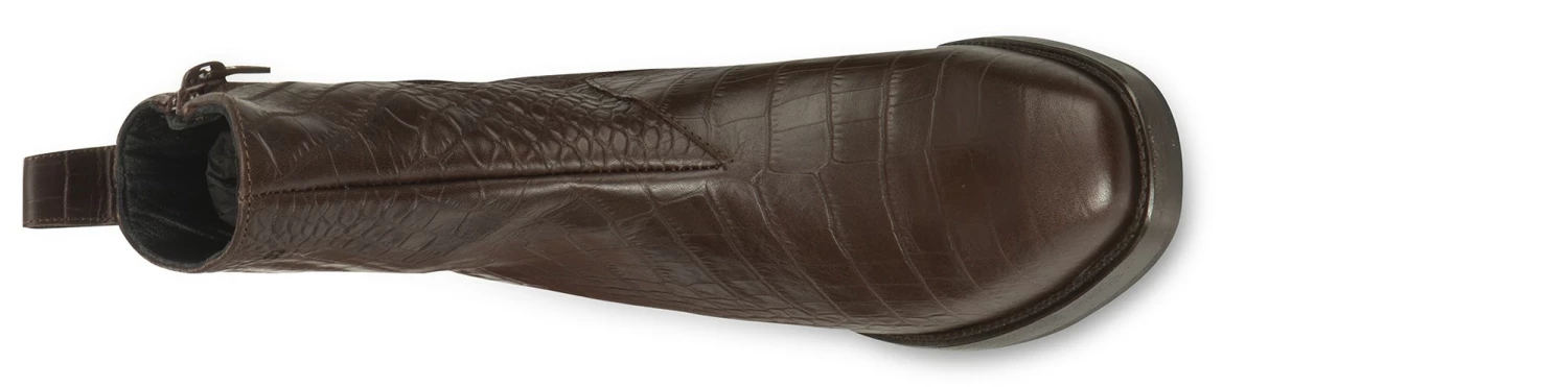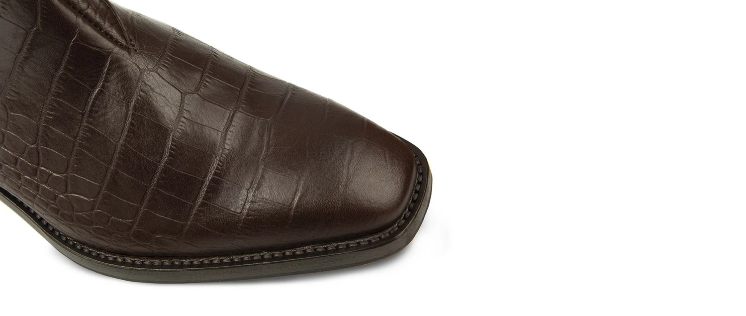 The Chelsea boot from the new GuidoMaggi collection is characterized by elegance and style: it has a convenient side zipper and a shoe puller. It features linear and clean shapes, enhanced even more by the square tip. The upper is in dark brown calfskin with an exclusive crocodile effect. It has a discreet lifting system that gives up to 4.0″ of extra height. Comfortable and elegant footwear, in the name of the best accessible luxury. 100% made in Italy.