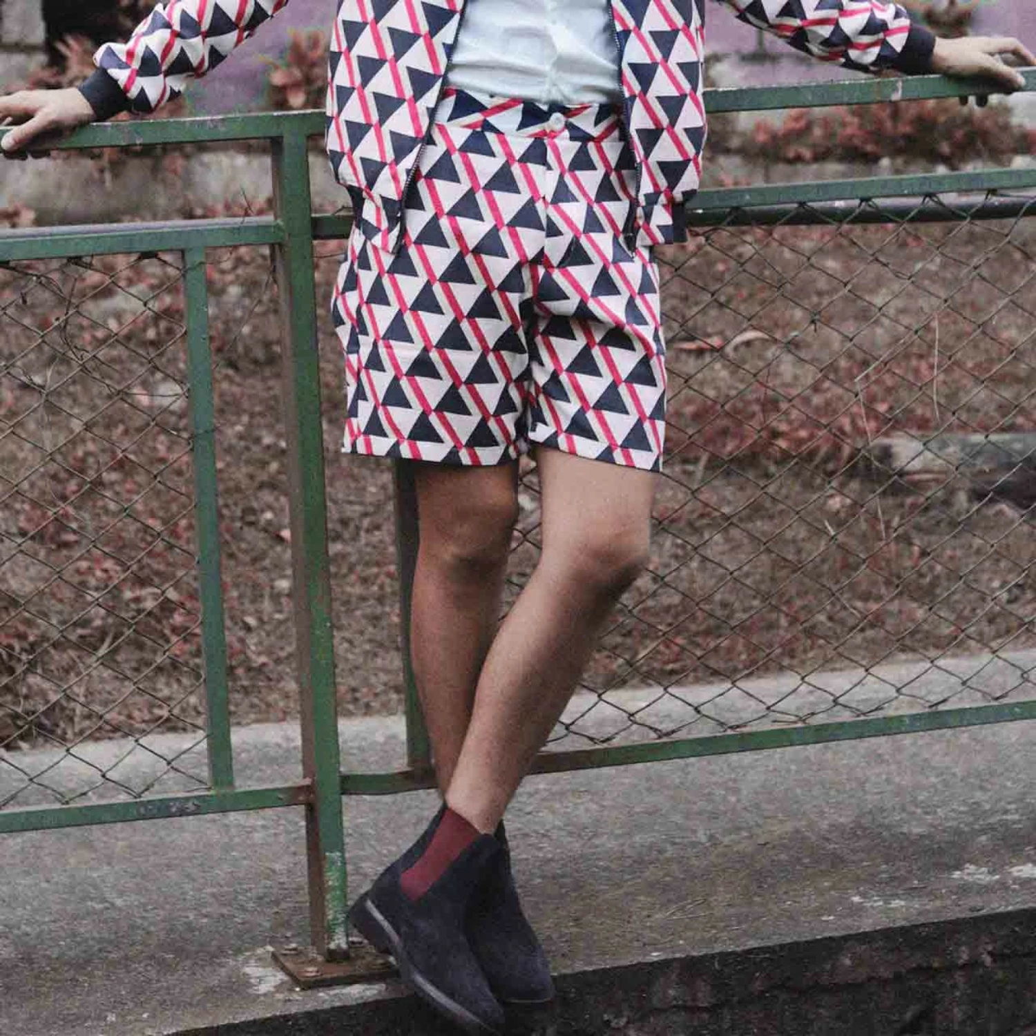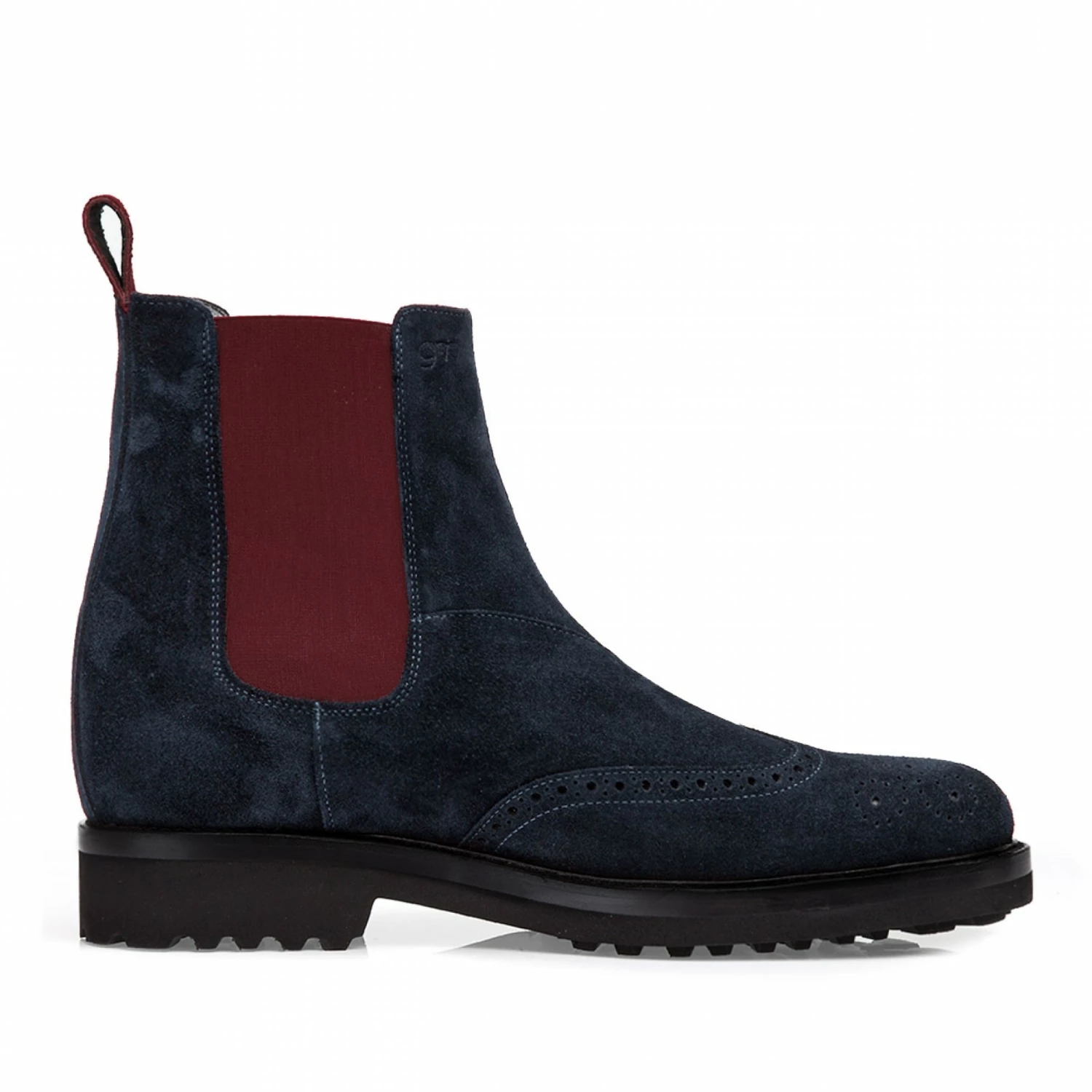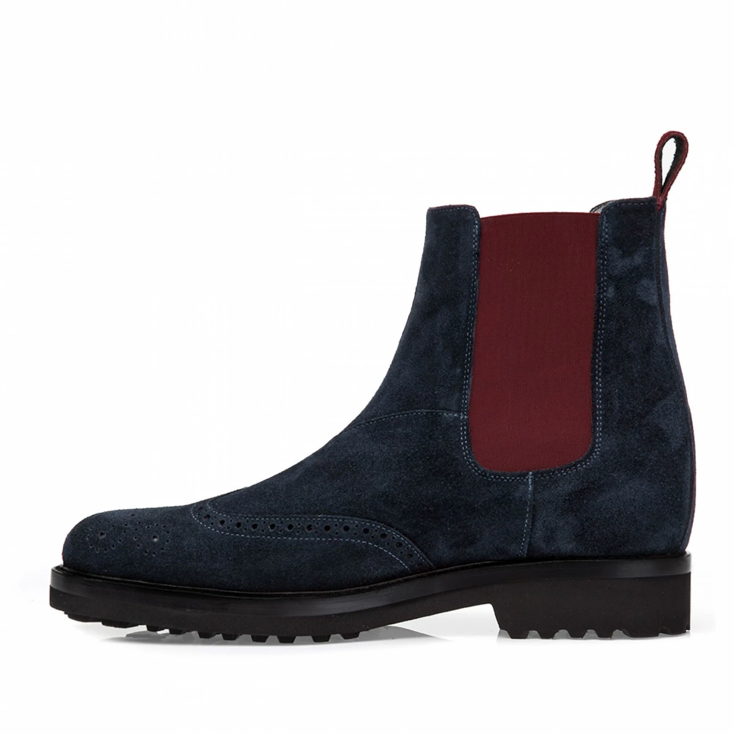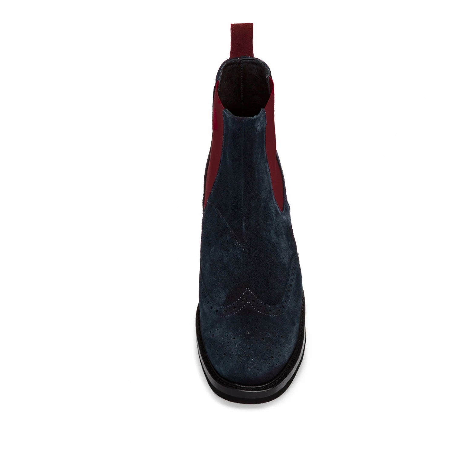 Modern version of the classic Chelsea boot with a British style and a slender design, featuring upper made of dark blue suede stamped by hand and burgundy side elastic bands.