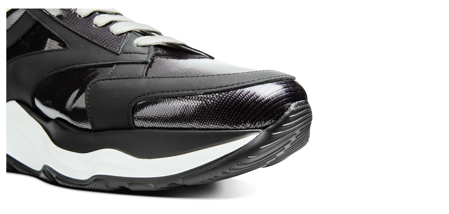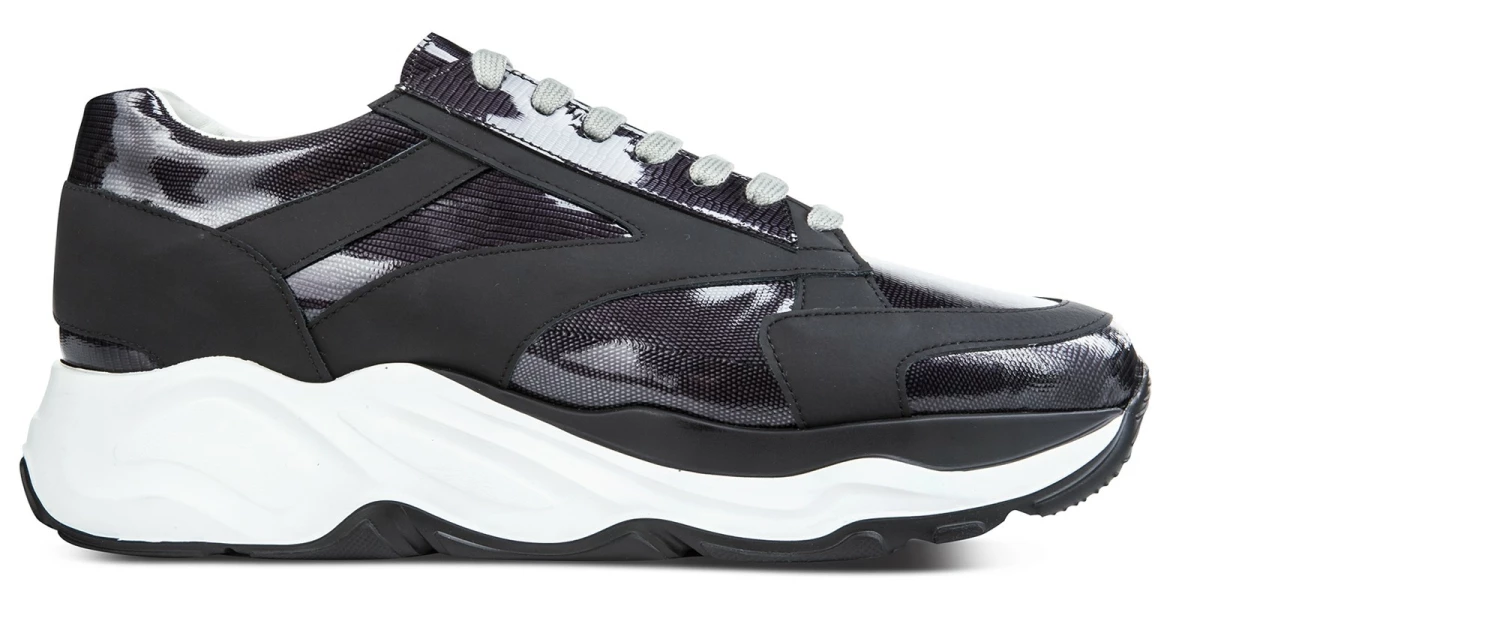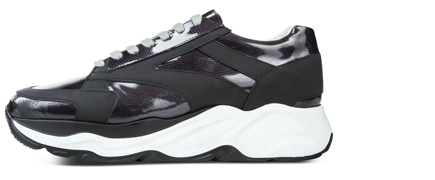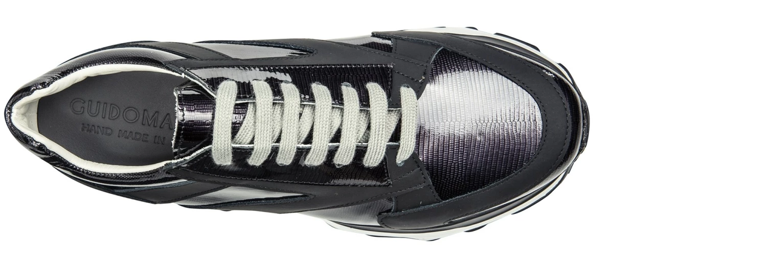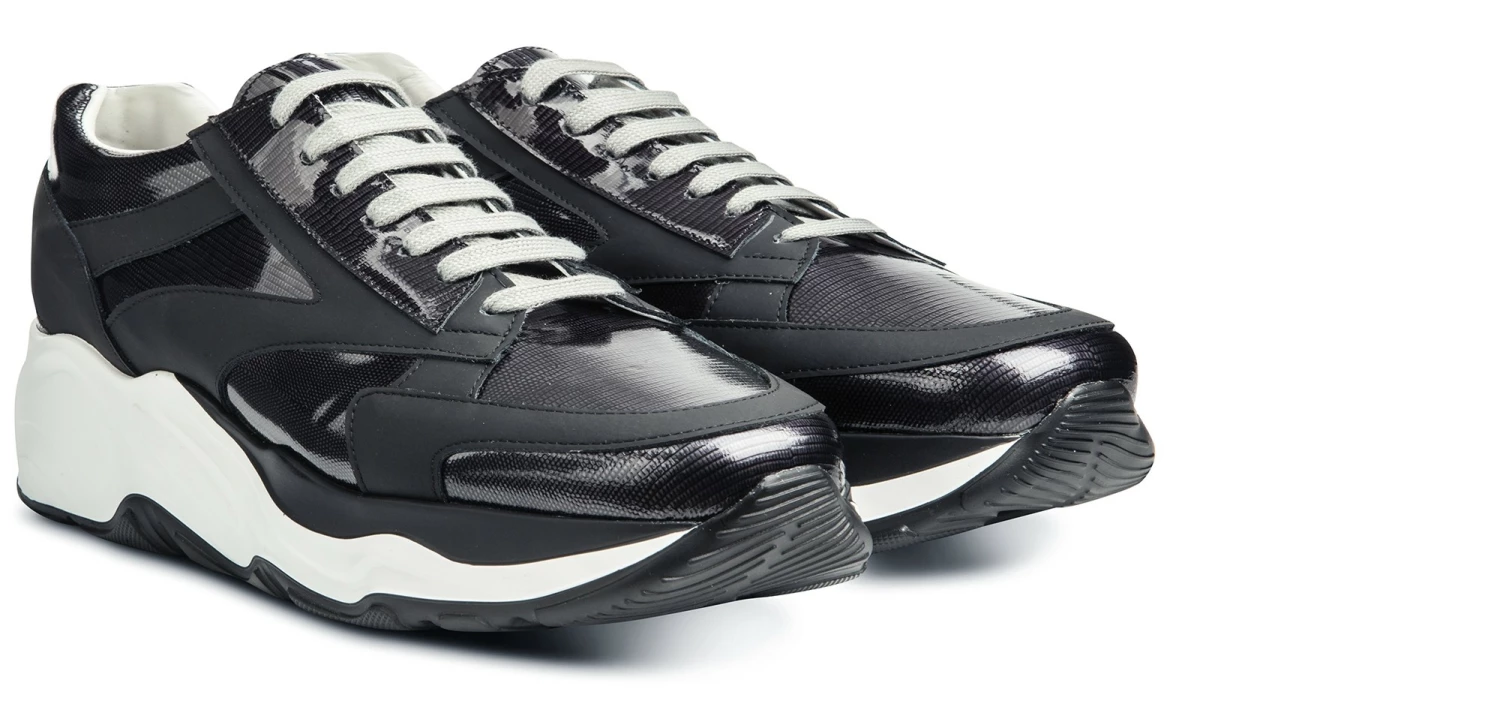 The new GuidoMaggi elevator sneaker combines comfort and style. This chunky elevator model has a white sole with black details and treads. Highly cushioned, it gives a height increase of up to 4.3 inches (11 cm) in total discretion. The upper in dark shades is in rubberized calfskin and python-effect alf leather, with an iridescent colour base between grey and dark purple. The grey laces give a further chic touch to the urban-chic sneakers that revolutionized the concept of sports shoes and can also be matched with a formal suit. Handmade in Italy