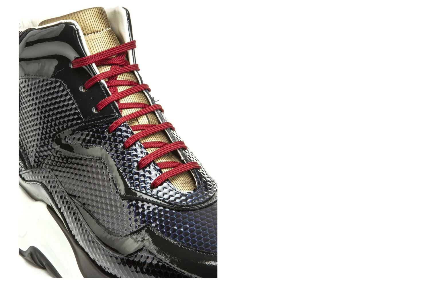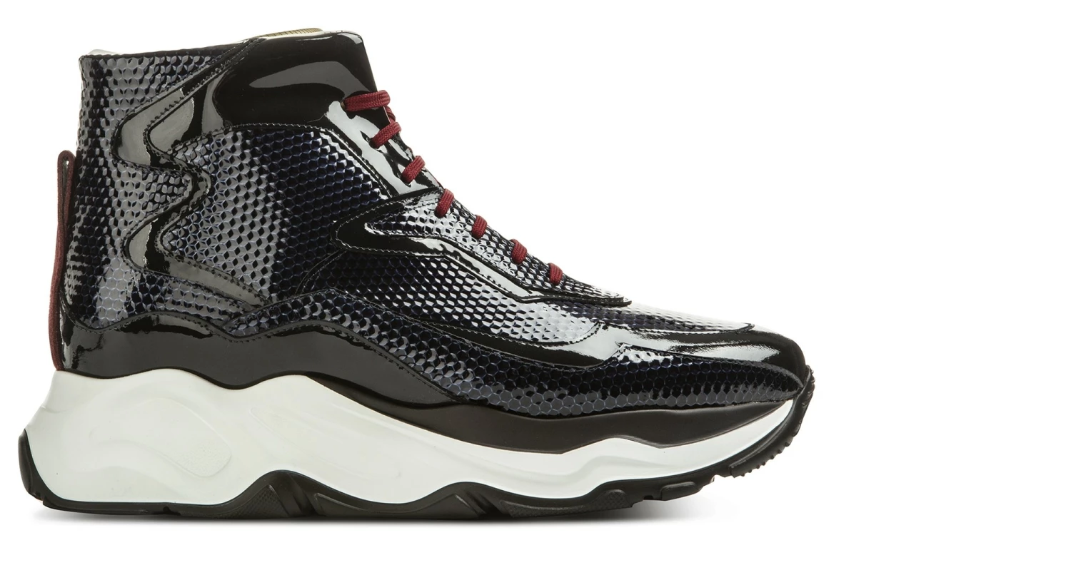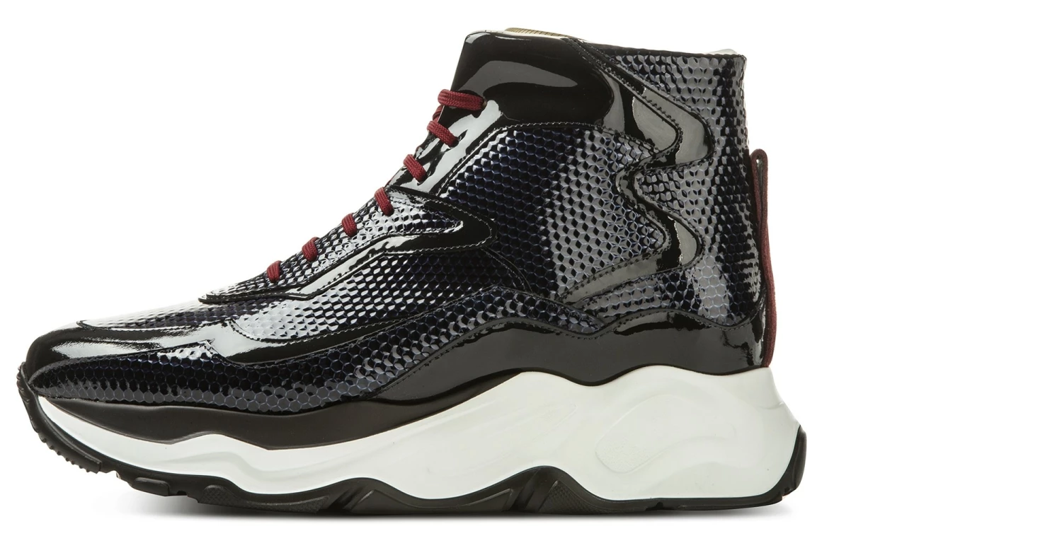 The GuidoMaggi spring-summer collection is enriched with these new hi-top sneakers. The upper is entirely in patent leather featuring different textures and shades, from smooth black to blue with a diamond effect. A super-light rubber sole and tongue in a golden carved effect Tuscan leather.
