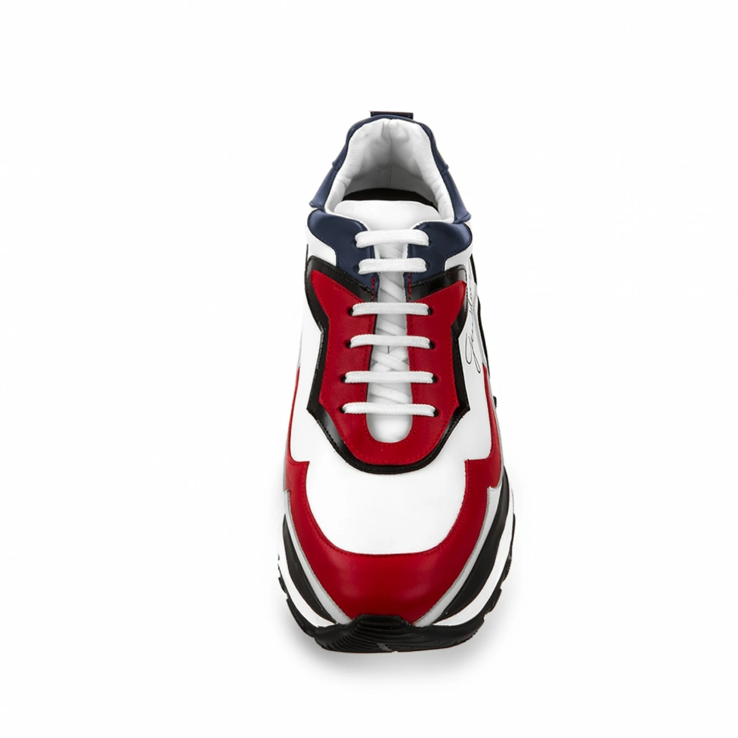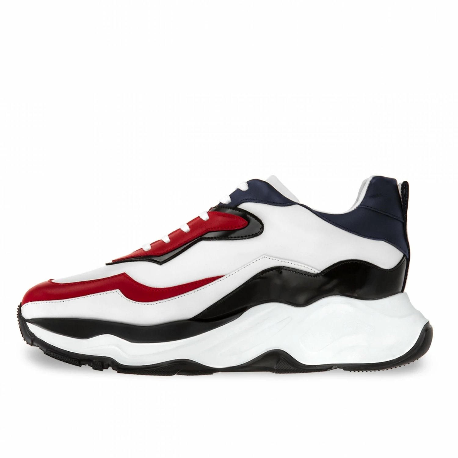 Giant Snake is handcrafted with upper made of white, red and blue full-grain leather and black shiny calfskin. The two-tone white / black sole is in extralight rubber. The Giant Snake model is able to increase height from 2.4 (6 cm) up to 4.3 inches (11 cm) in an invisible and discreet way.