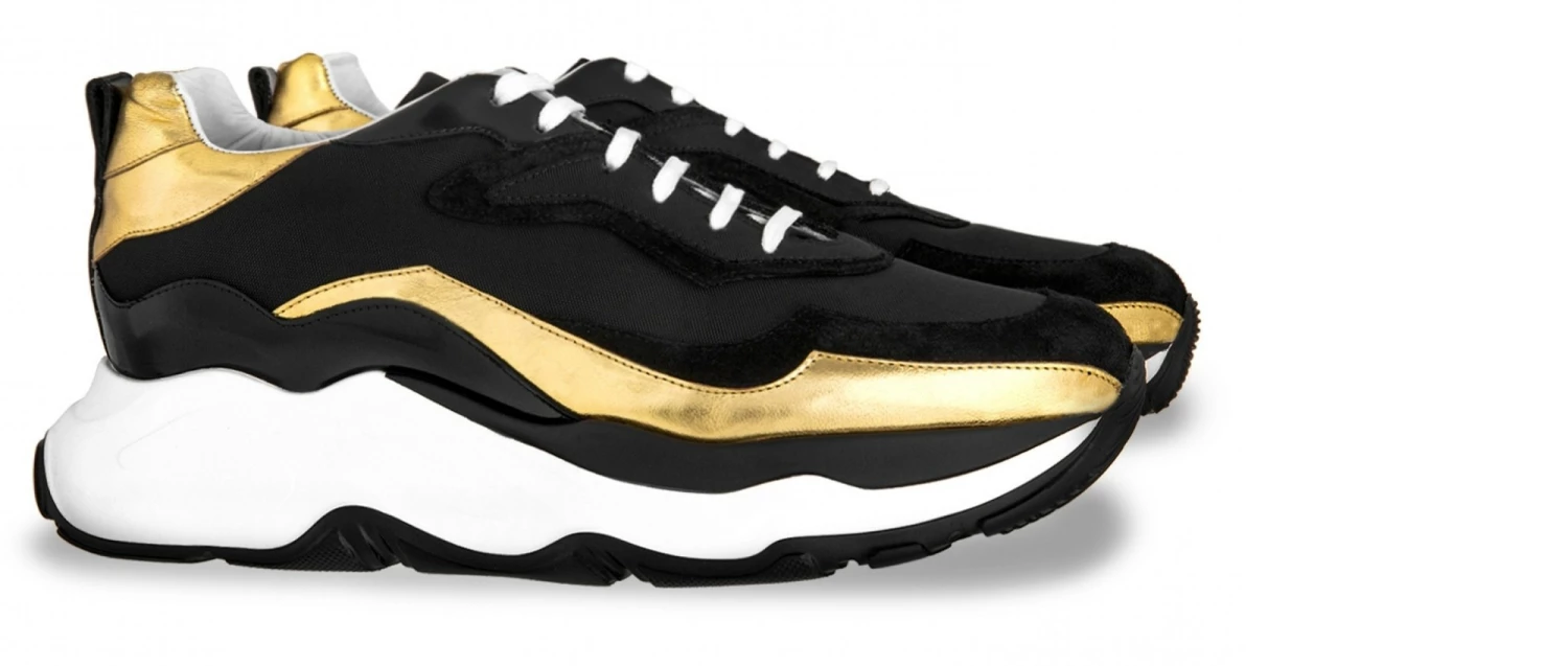 Black & Gold: elevator chunky sneakers with upper made of gold calf leather, black breathable technical fabric, shiny calfskin and tone-on-tone suede. The two-tone sole is made of extralight rubber.