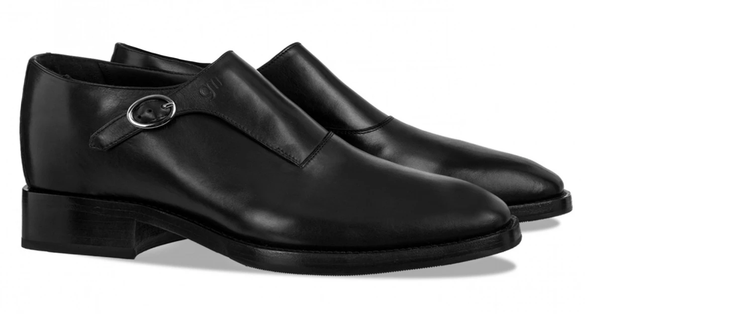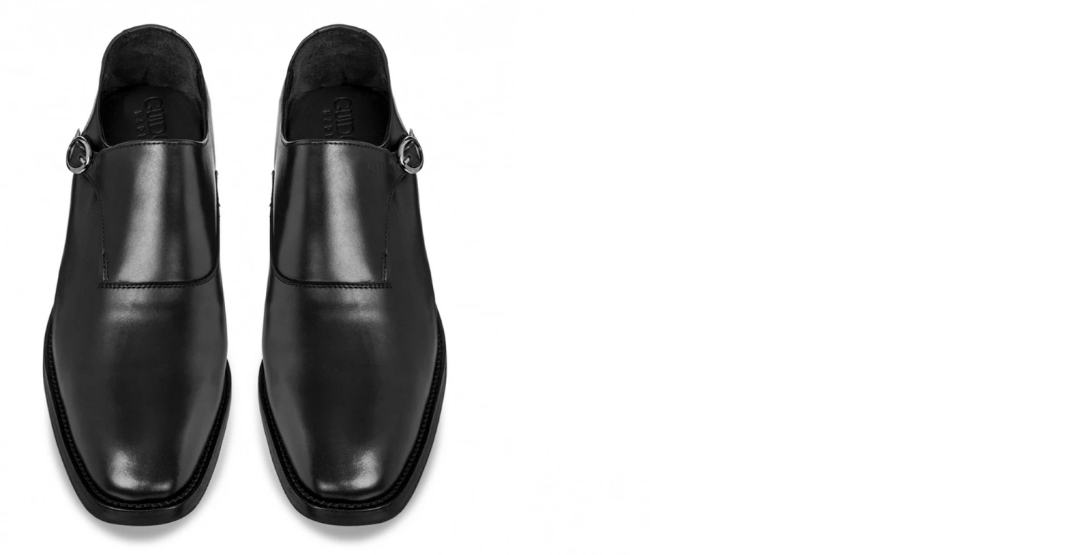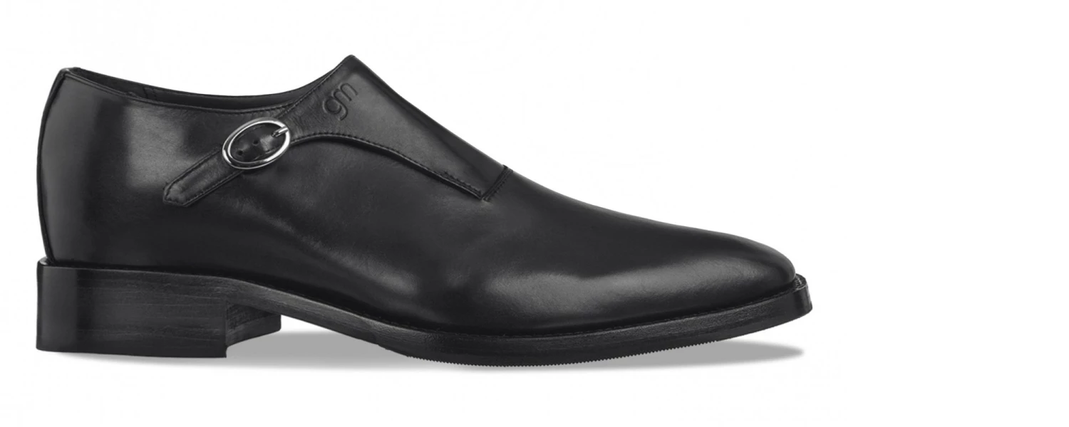 Handcrafted single monk strap elevator shoes with upper in soft full grain black leather and sole in genuine leather stitched at sight, with anti-slip rubber.