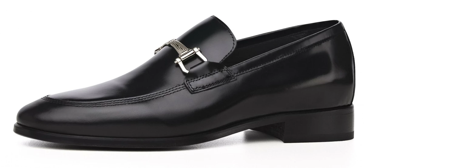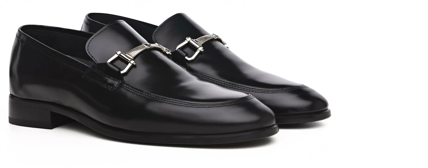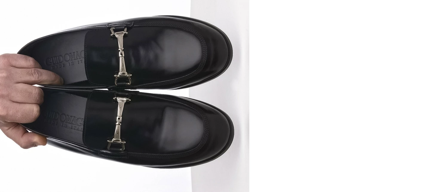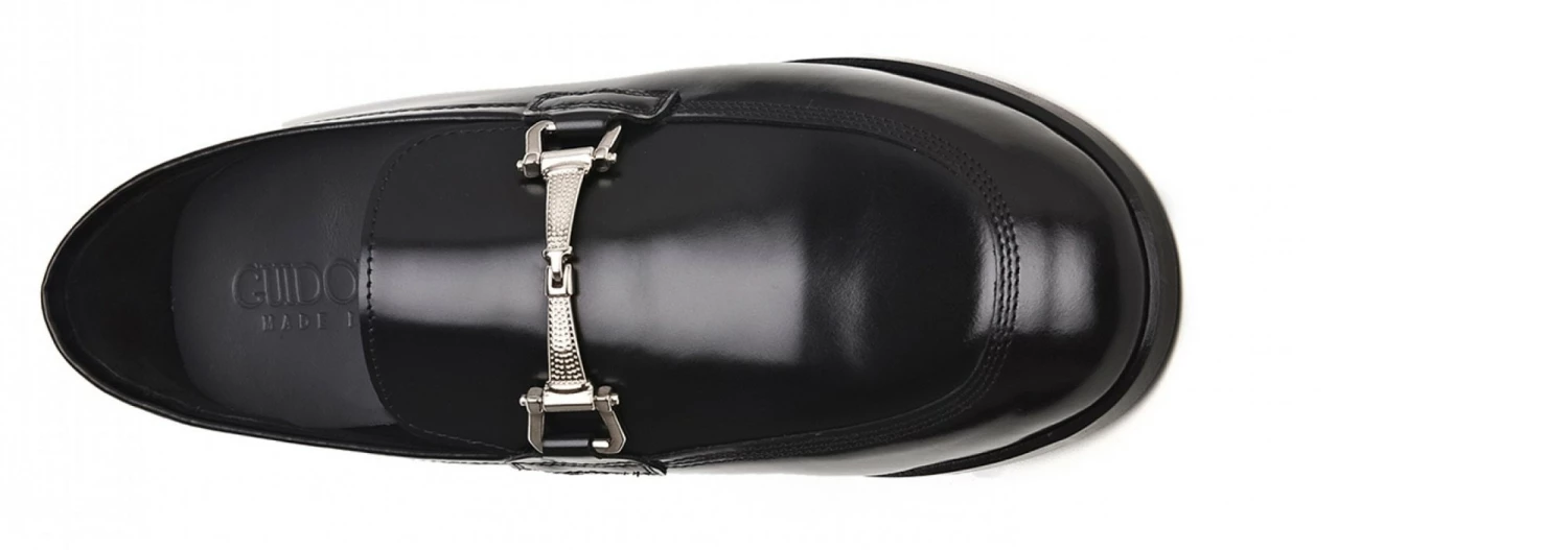 Elegant elevator loafers in black shiny calfskin featuring silver clamp and stiched leather sole with anti slip rubber. The triple stitching on the upper emphasizes its craftsmanship giving refinement to the most formal outfits.