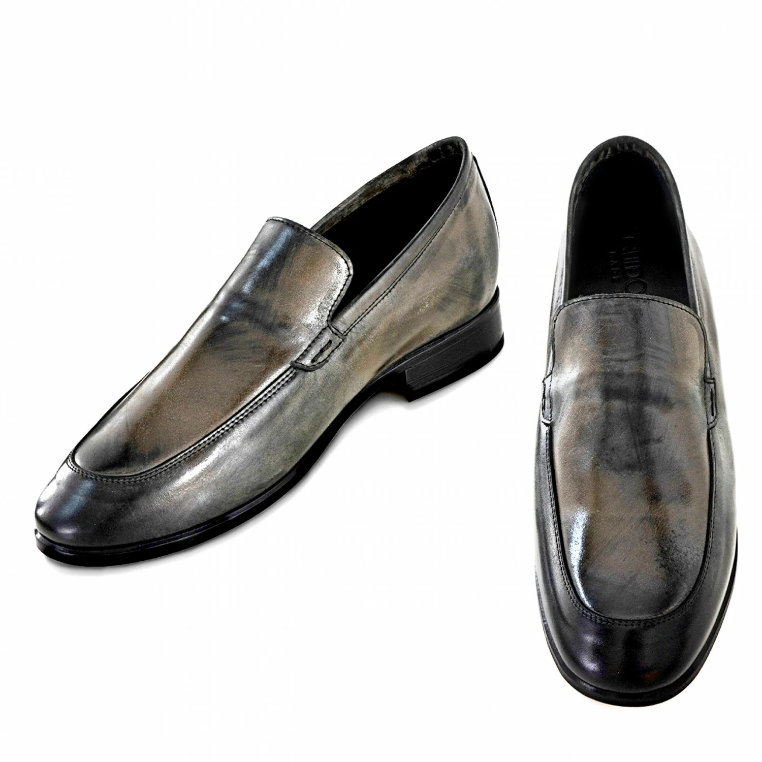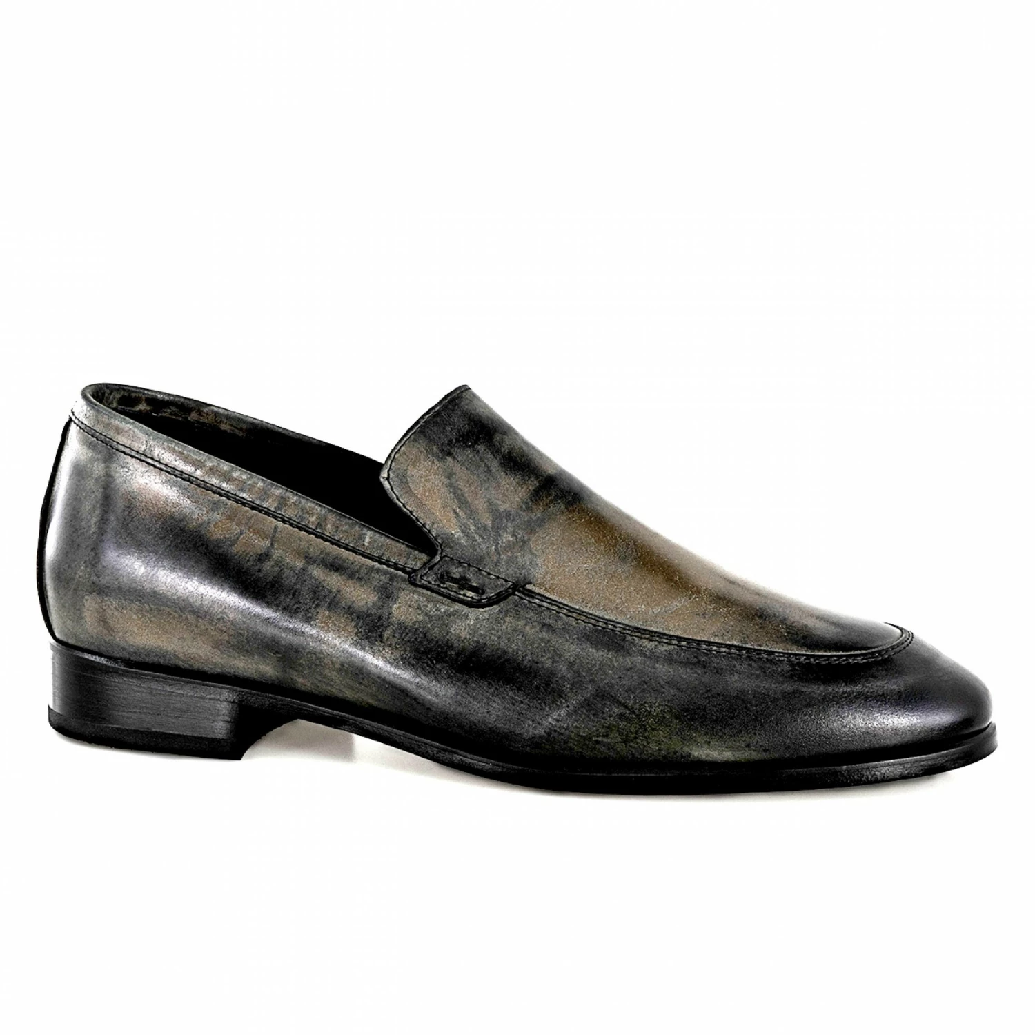 Elevator loafers handcrafted in Italy with upper in hand-buffered black calf leather with a unique aged effect and stiched leather sole with anti slip rubber.