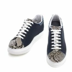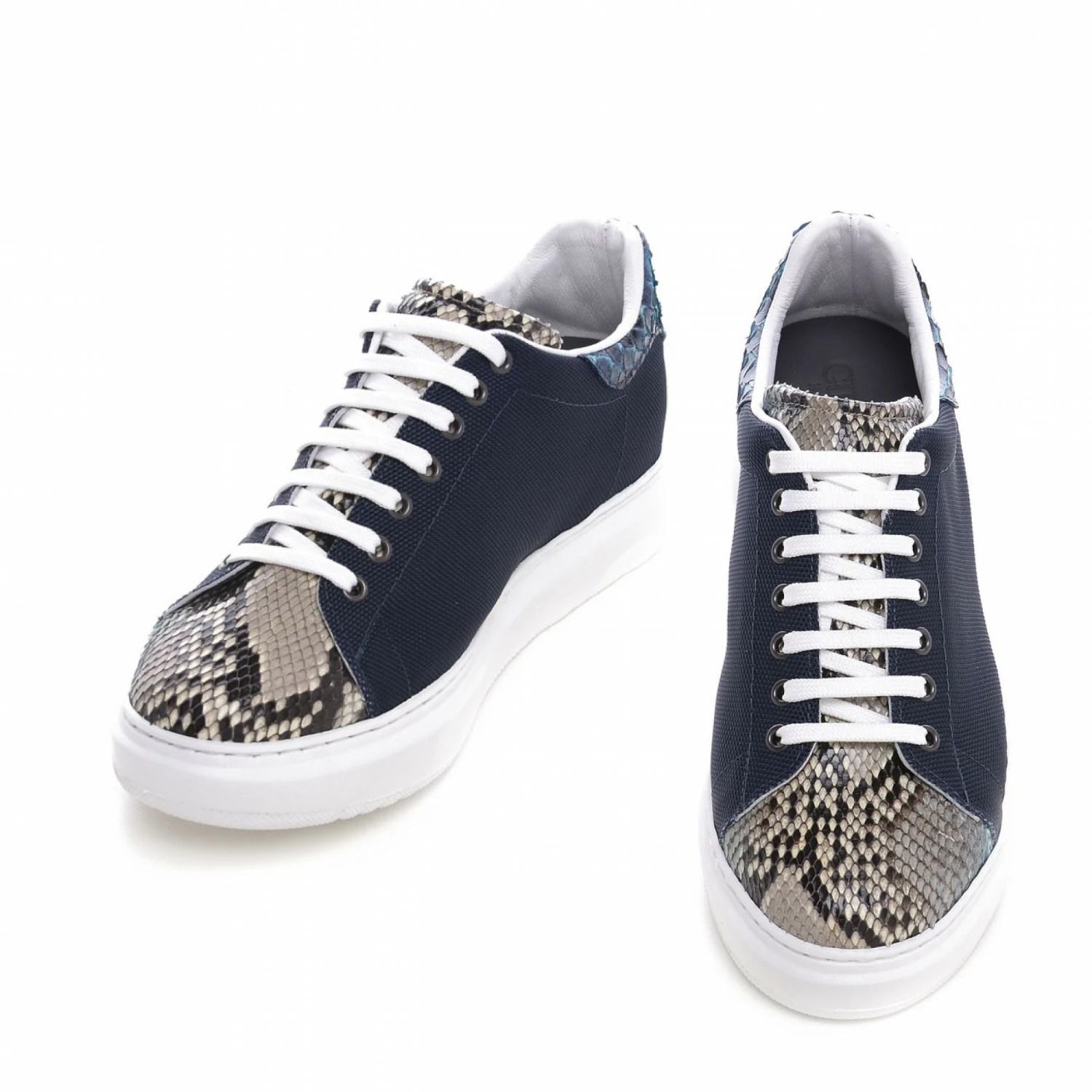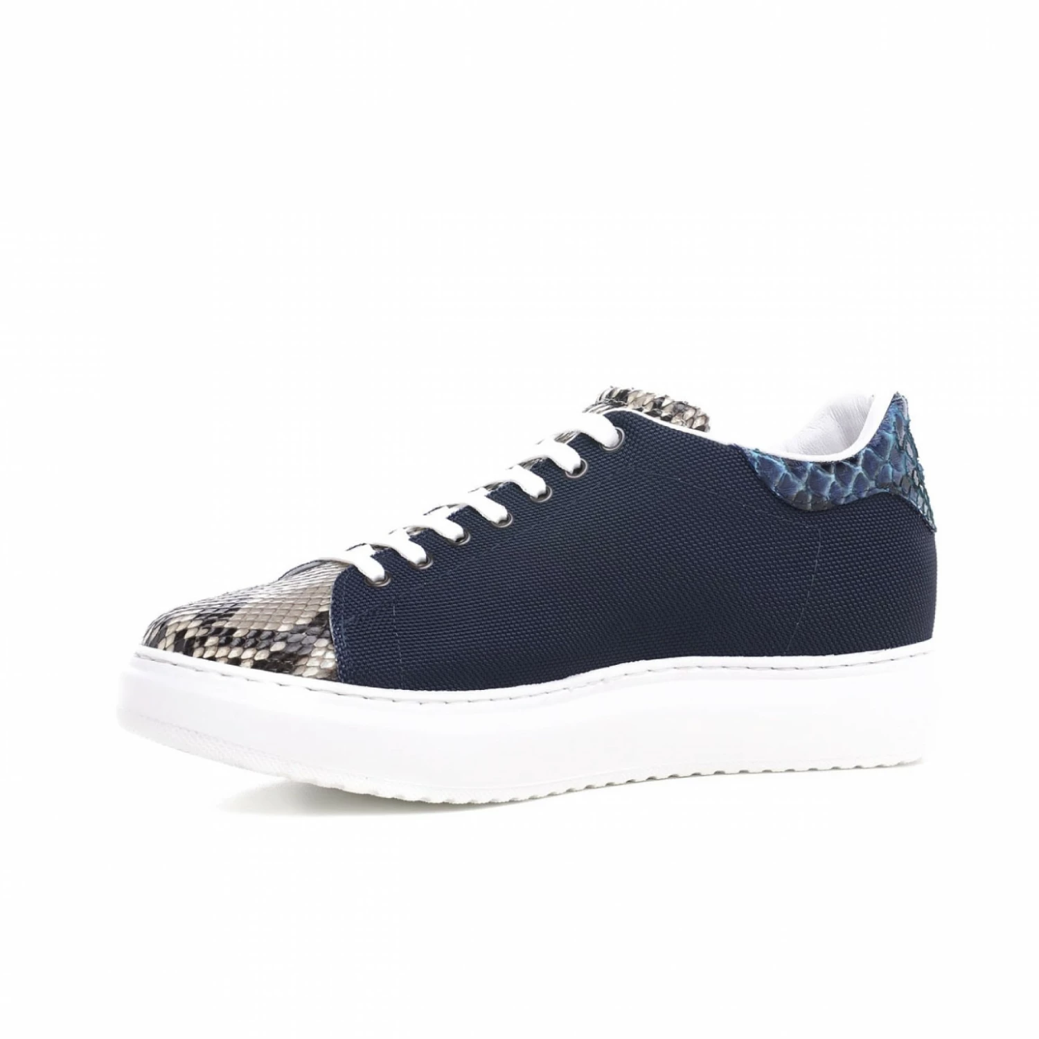 Handcrafted elevator sneakers with upper in blue navy fabric embellished with fine details in python leather on the toe, tongue and heel tab. The sole is in super-light natural rubber.